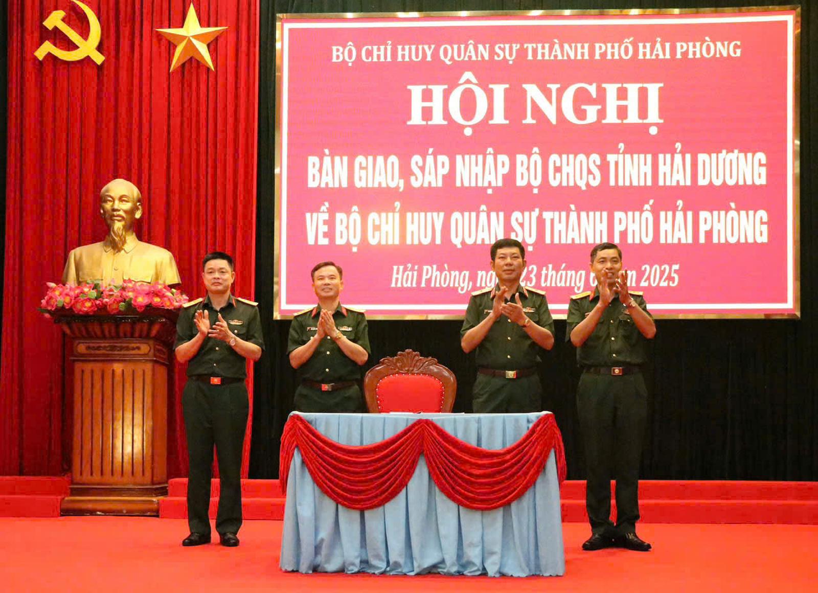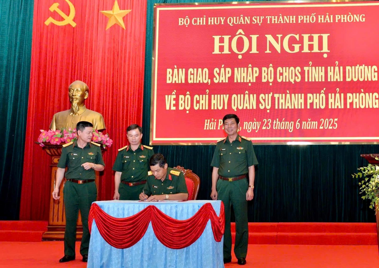 Lãnh đạo Bộ Chỉ huy Quân sự thành phố thông qua biên bản tiếp nhận bàn giao công tác tham mưu, công tác đảng, chính trị, hậu cần - kỹ thuật… từ Bộ Chỉ huy Quân sự tỉnh Hải Dương, sẵn sàng cho hợp nhất tỉnh Hải Dương và thành phố Hải Phòng từ 1/7/2025.