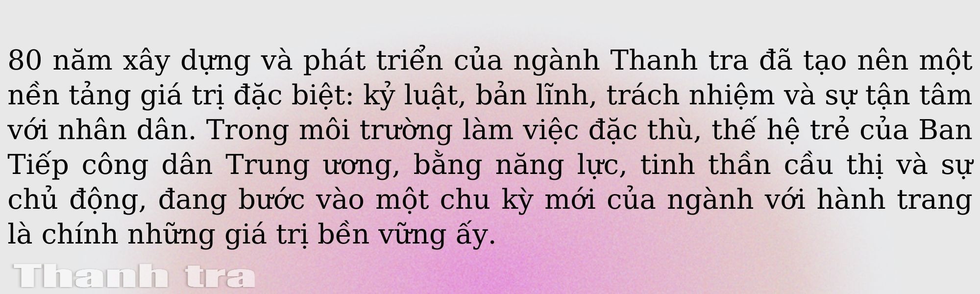 Khi số vụ việc đông người, phức tạp, liên quan tới nhiều cấp, nhiều ngành ngày càng tăng, áp lực đè lên vai cán bộ trẻ không hề nhỏ. Nhưng chính trong bối cảnh đó, truyền thống 80 năm của ngành trở thành điểm tựa đáng tin cậy. Những phẩm chất như mềm dẻo trong giao tiếp, chắc chắn trong lập luận, hay sự bình tĩnh trước các tình huống nóng chính là “tài sản vô hình” mà thế hệ đi trước đã truyền lại để lớp trẻ bước vào công việc với tâm thế vững vàng.