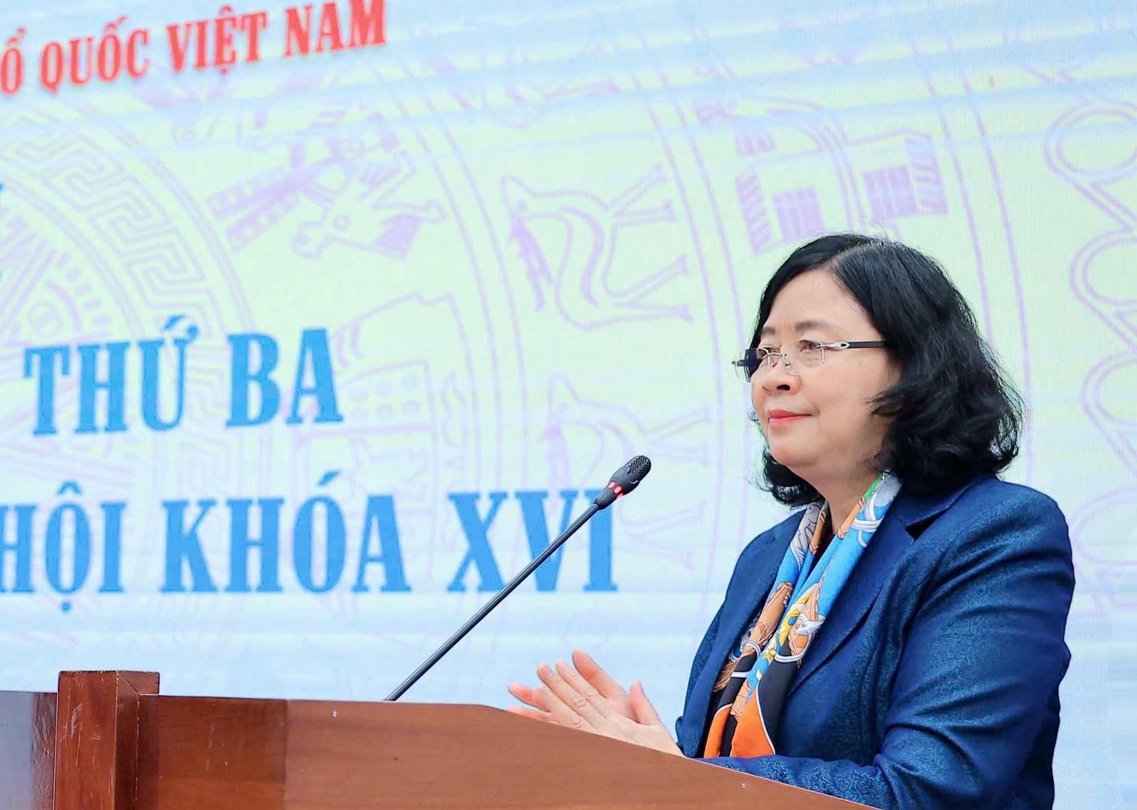 Chủ tịch UBTƯ MTTQ Việt Nam Bùi Thị Minh Hoài cho biết, hội nghị hiệp thương lần thứ ba là bước quan trọng trong quy trình bầu cử. Ảnh: H.N