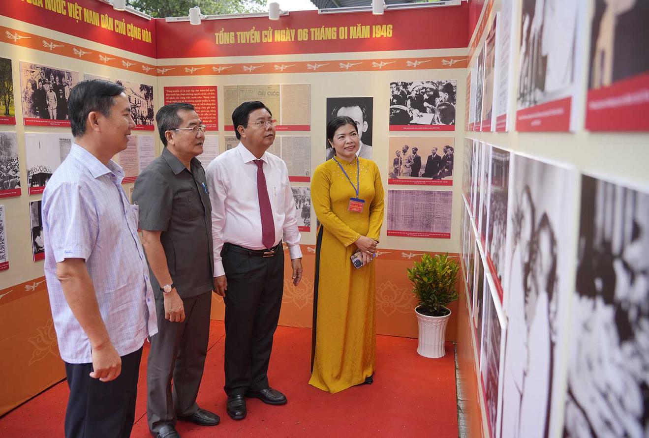 Bí thư Tỉnh ủy An Giang Nguyễn Tiến Hải tại triển lãm một số hình ảnh về Chủ tịch Hồ Chí Minh với Quốc hội Việt Nam sau khi thực hiện quyền bầu cử tại tổ bầu cử số 68, đơn vị bầu cử số 6, phường Rạch Giá. Ảnh: Cổng TTĐT An Giang