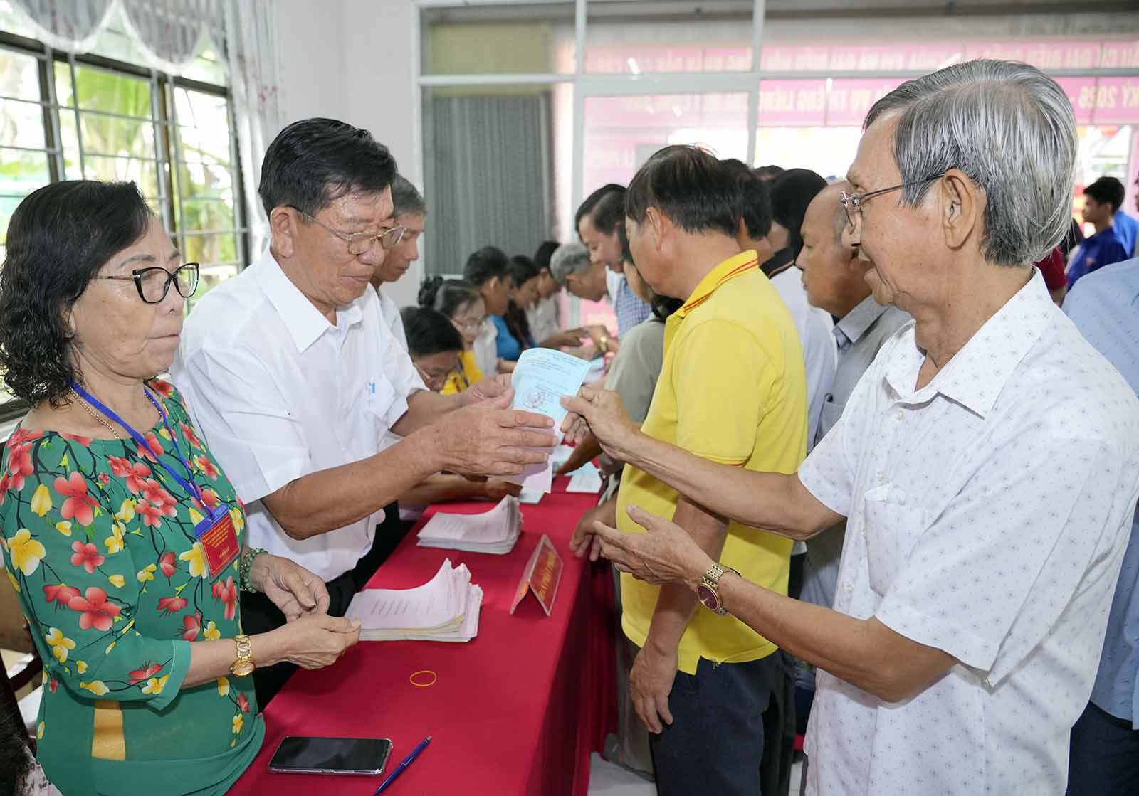 Cử tri nhận phiếu bầu tại đơn vị bầu cử số 6, phường Rạch Giá. Ảnh: Cổng TTĐT An Giang