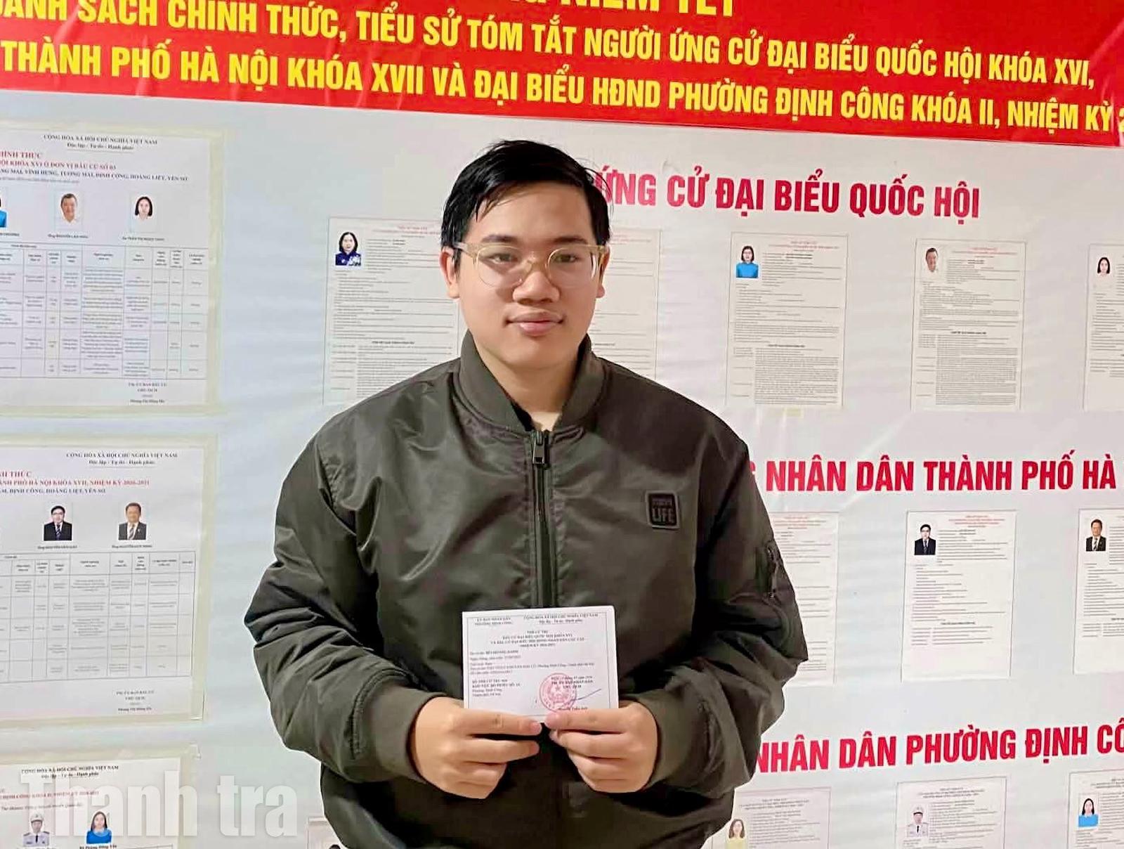 Cử tri trẻ Bùi Hoàng Danh, khu vực bỏ phiếu số 24, phường Định Công, thành phố Hà Nội. Ảnh: Thanh Lương
