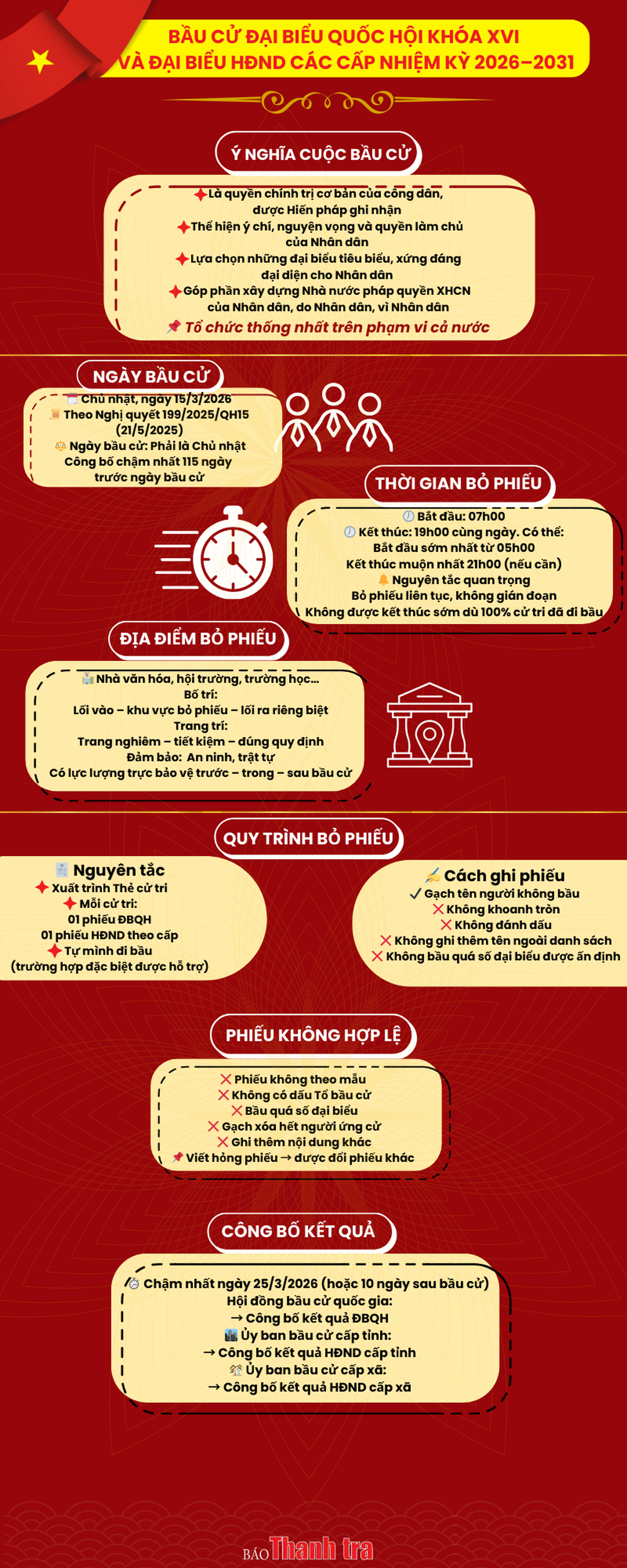 (Thanh tra) - Cuộc bầu cử đại biểu Quốc hội khóa XVI và đại biểu HĐND các cấp nhiệm kỳ 2026-2031, là sự kiện chính trị quan trọng của đất nước, diễn ra ngay sau Đại hội đại biểu toàn quốc lần thứ XIV của Đảng.
