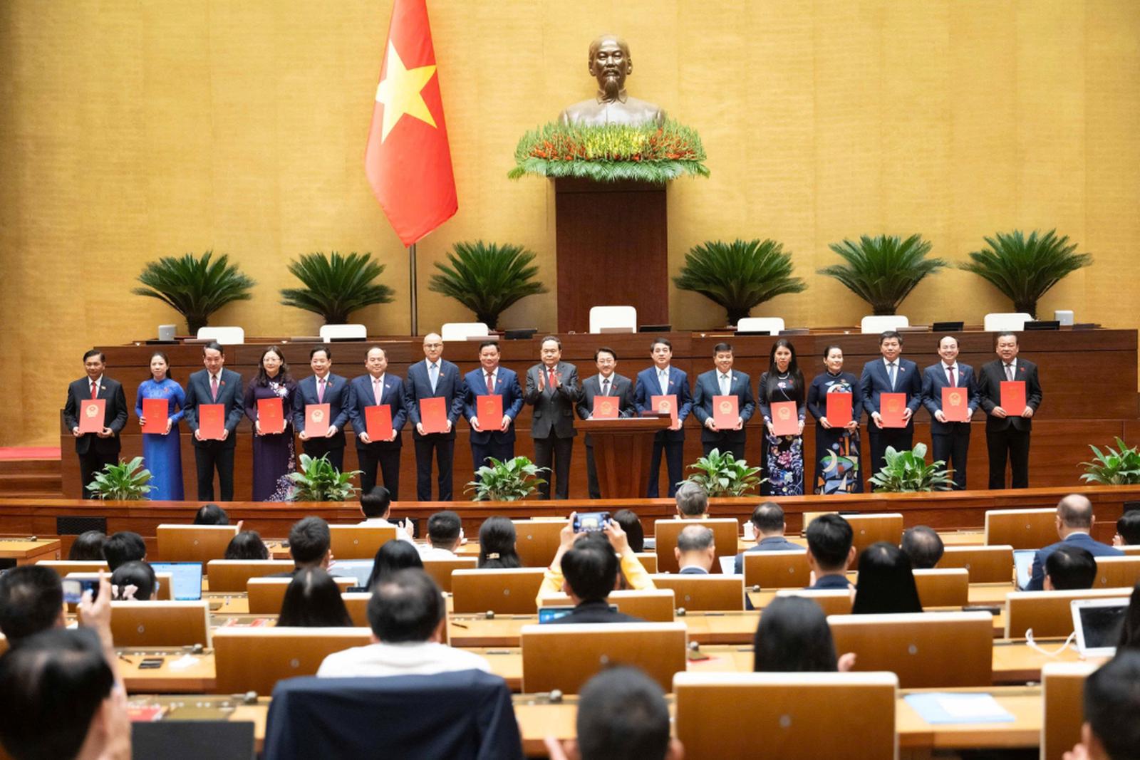Chủ tịch Quốc hội Trần Thanh Mẫn trao Nghị quyết của Ủy ban Thường vụ Quốc hội phê chuẩn Trưởng Đoàn ĐBQH khóa XVI cho Bí thư Tỉnh ủy Quảng Ninh Quản Minh Cường và Trưởng Đoàn ĐBQH các địa phương. Ảnh: Q.M.G