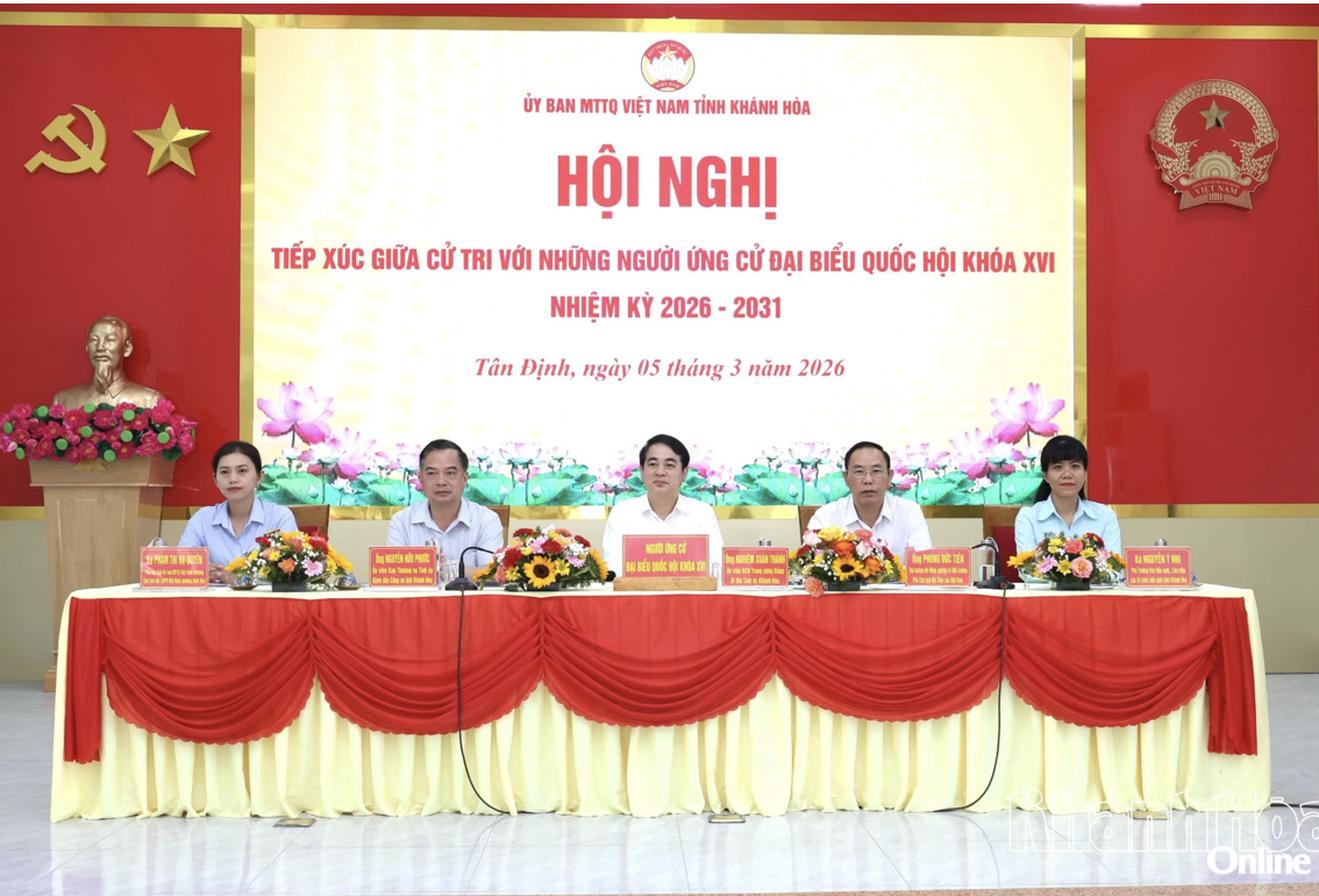 (Thanh tra) - Chiều 5/3, tại xã Tân Định, Bí thư Tỉnh ủy Khánh Hòa Nghiêm Xuân Thành cùng các ứng cử viên đại biểu Quốc hội khóa XVI thuộc đơn vị bầu cử số 1 đã tiếp xúc cử tri, trình bày chương trình hành động và lắng nghe nhiều ý kiến, kiến nghị liên quan đến phát triển kinh tế – xã hội địa phương. Nhiều vấn đề về hạ tầng, khu công nghiệp, hỗ trợ sản xuất nông nghiệp và tiếp cận nguồn vốn tín dụng được cử tri quan tâm, kỳ vọng các đại biểu dân cử tiếp tục kiến nghị, thúc đẩy tháo gỡ trong thời gian tới.