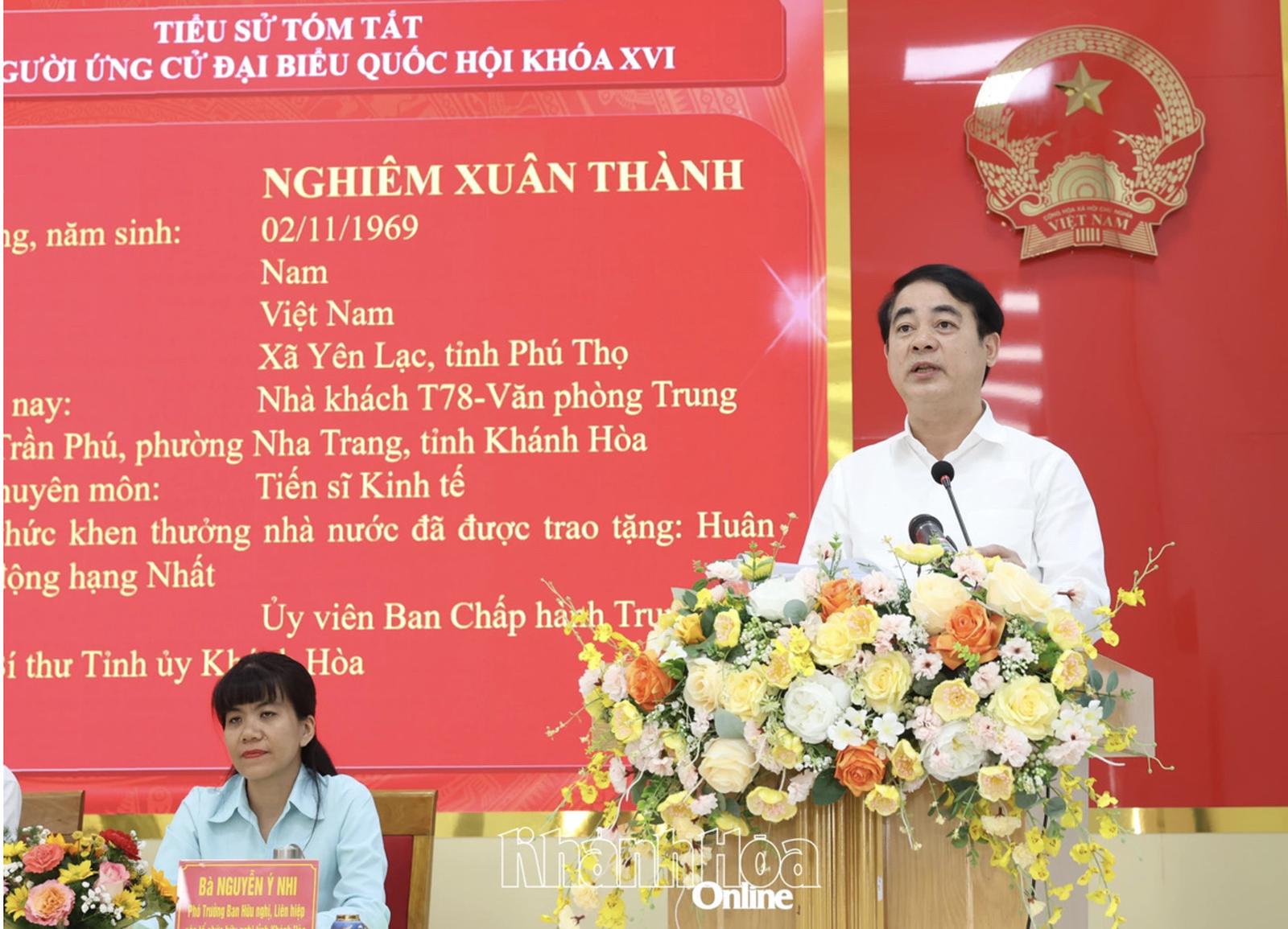 Tại hội nghị, đại diện Ban Thường trực Ủy ban MTTQ Việt Nam tỉnh đã giới thiệu tiểu sử tóm tắt của 5 ứng cử viên đại biểu Quốc hội khóa XVI gồm các ông, bà: Nghiêm Xuân Thành – Ủy viên Trung ương Đảng, Bí thư Tỉnh ủy Khánh Hòa; Phùng Đức Tiến – Thứ trưởng Bộ Nông nghiệp và Môi trường, Phó Chủ tịch Hội Thủy sản Việt Nam; Thiếu tướng Nguyễn Hữu Phước – Giám đốc Công an tỉnh; Phạm Thị Hạ Quyên – Phó Chủ tịch Ủy ban MTTQ Việt Nam phường, Chủ tịch Hội Liên hiệp Phụ nữ phường Ninh Hòa; và Nguyễn Ý Nhi – Phó Trưởng ban Hữu nghị Liên hiệp Các tổ chức hữu nghị tỉnh.
