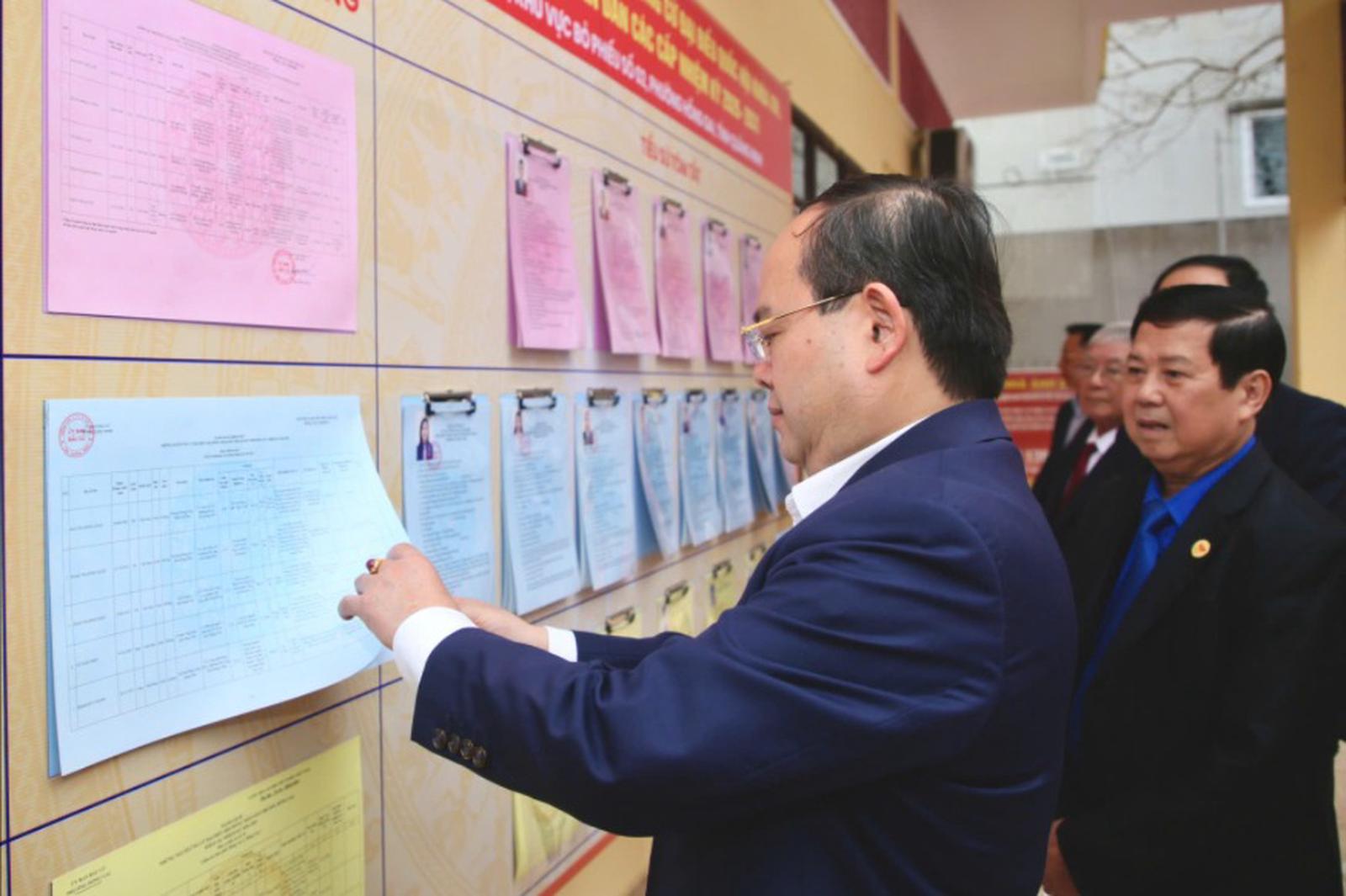 Bí thư Tỉnh ủy Quản Minh Cường kiểm tra việc niêm yết danh sách người ứng cử tại khu vực bỏ phiếu số 2, Nhà văn hóa khu Hồng Gai 2, phường Hồng Gai. Ảnh: Thu Chung
