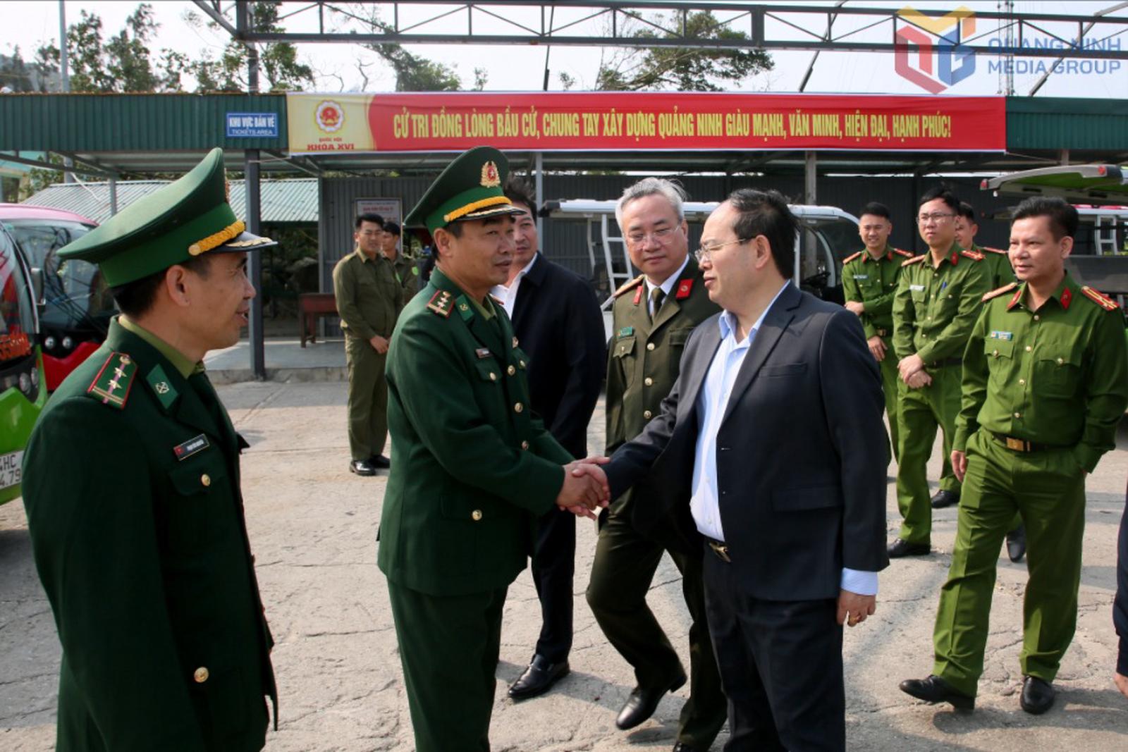 Bí thư Tỉnh ủy Quảng Ninh Quản Minh Cường gặp gỡ, trao đổi với lực lượng vũ trang về công tác bảo đảm an ninh, trật tự phục vụ bầu cử tại đặc khu Vân Đồn. Ảnh: Thu Chung