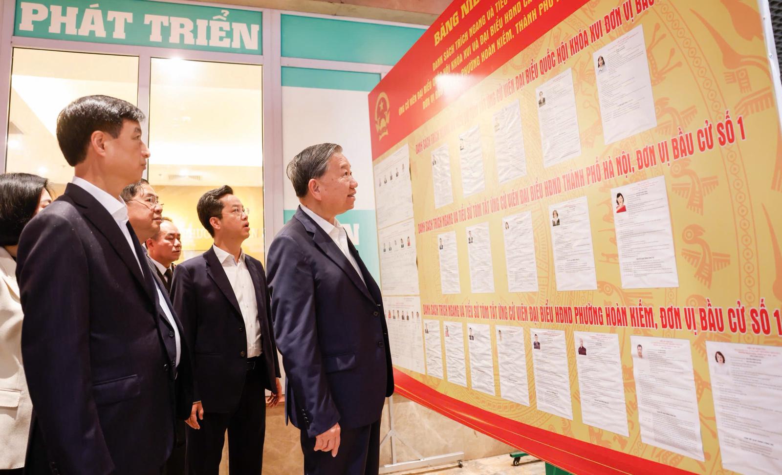 Tổng Bí thư Tô Lâm sáng nay dự hội nghị tiếp xúc cử tri với người ứng cử đại biểu Quốc hội khóa XVI. Trước khi vào hội nghị, Tổng Bí thư đã kiểm tra công tác chuẩn bị cho bầu cử tại trụ sở UBND phường Hoàn Kiếm, Hà Nội. Ảnh: Đ.X