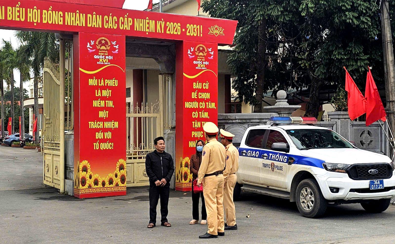 Cảnh sát giao thông chủ động phương án bảo đảm giao thông trên các tuyến đường dẫn đến khu vực bỏ phiếu. Ảnh: Công an Thanh Hoá
