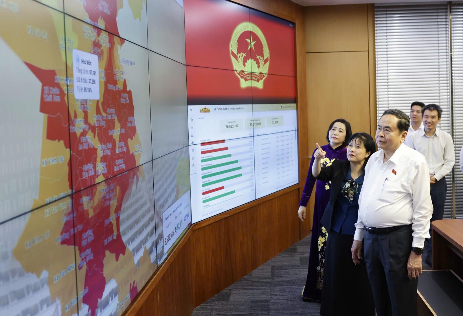 Chủ tịch Quốc hội Trần Thanh Mẫn thăm Văn phòng Hội đồng Bầu cử quốc gia. Ảnh: P.Thắng