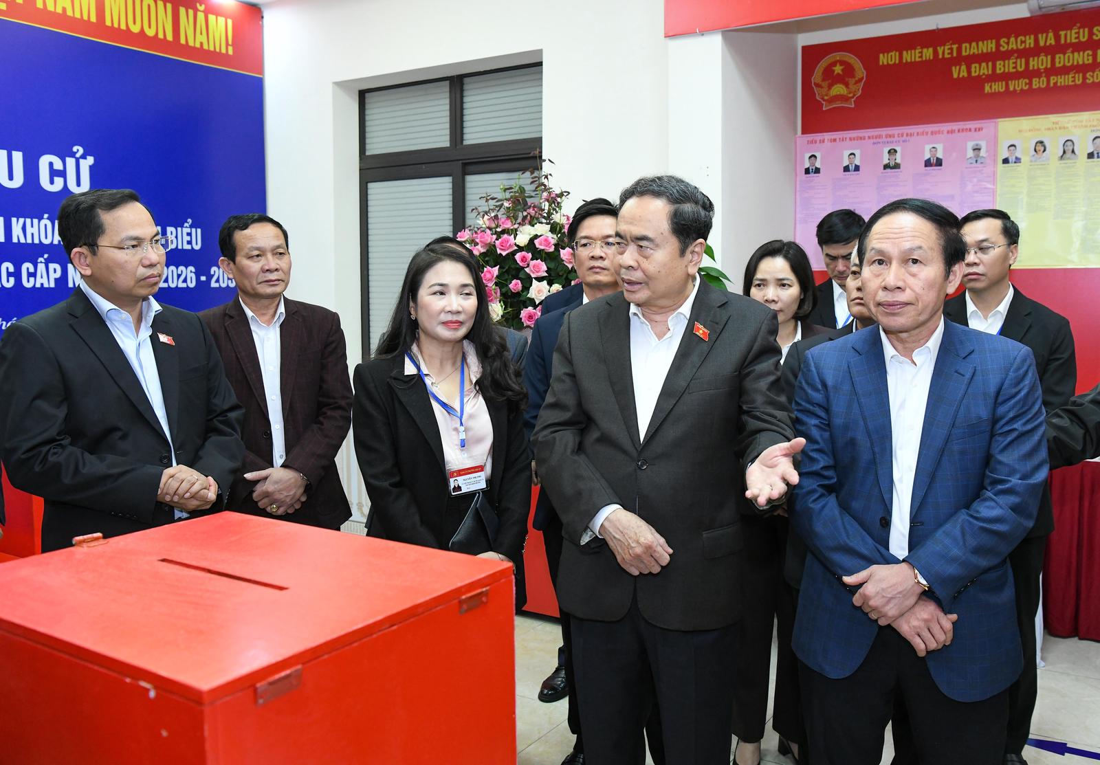 Chủ tịch Quốc hội Trần Thanh Mẫn khảo sát thực tế tại khu vực bỏ phiếu số 8, phường Hải An, TP Hải Phòng. Ảnh: Lâm Hiển