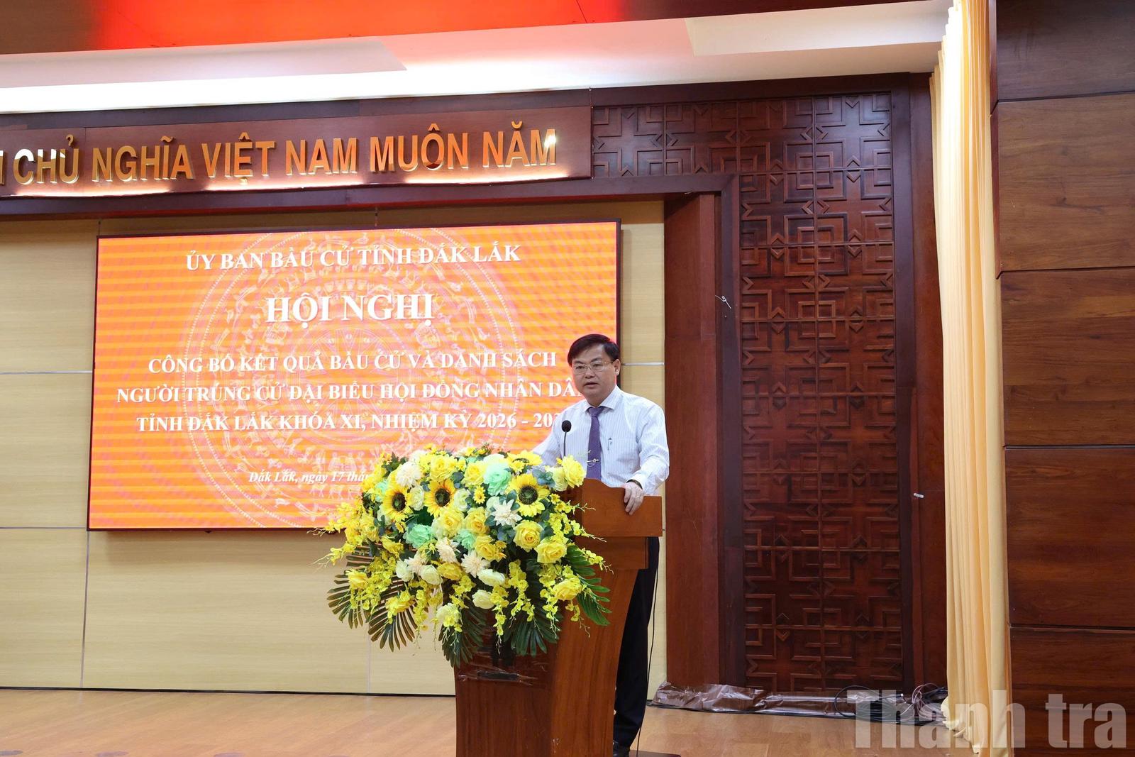 Đại diện Ủy ban Bầu cử tỉnh Đắk Lắk công bố danh sách 84 đại biểu trúng cử đại biểu HĐND tỉnh nhiệm kỳ 2026 – 2031. Ảnh: NM