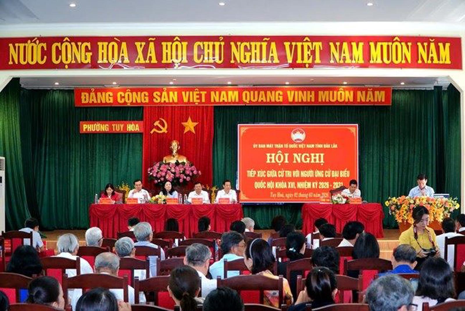 Ngày 2/3, tại phường Tuy Hòa, tỉnh Đắk Lắk, Ủy ban Mặt trận Tổ quốc (MTTQ) Việt Nam tỉnh Đắk Lắk tổ chức hội nghị tiếp xúc cử tri với những người ứng cử đại biểu Quốc hội khóa XVI, đơn vị bầu cử số 1.