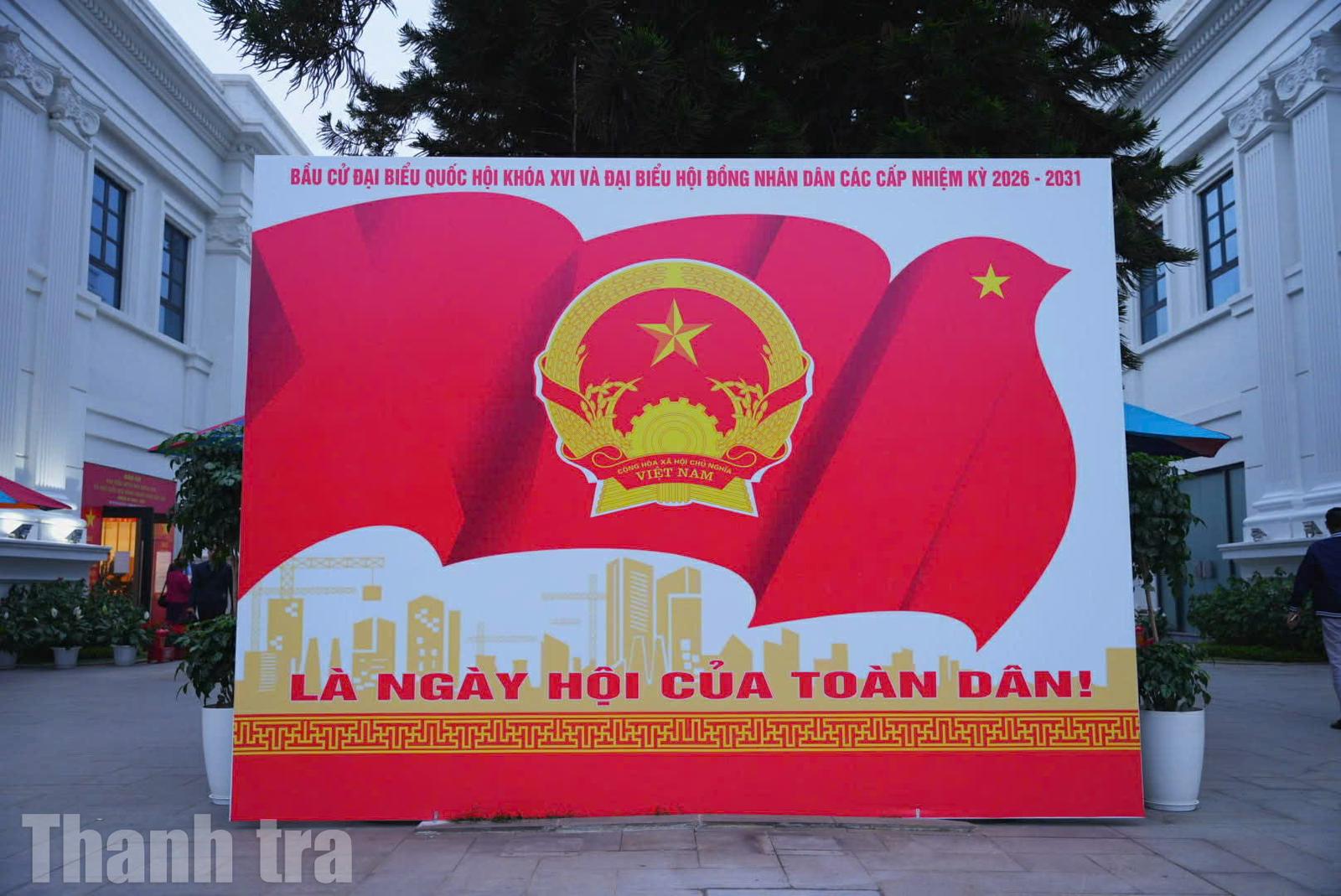 Cờ Tổ quốc, băng rôn, khẩu hiệu được trang hoàng trang trọng tại các điểm bầu cử, tạo nên khung cảnh rực rỡ và đầy khí thế.