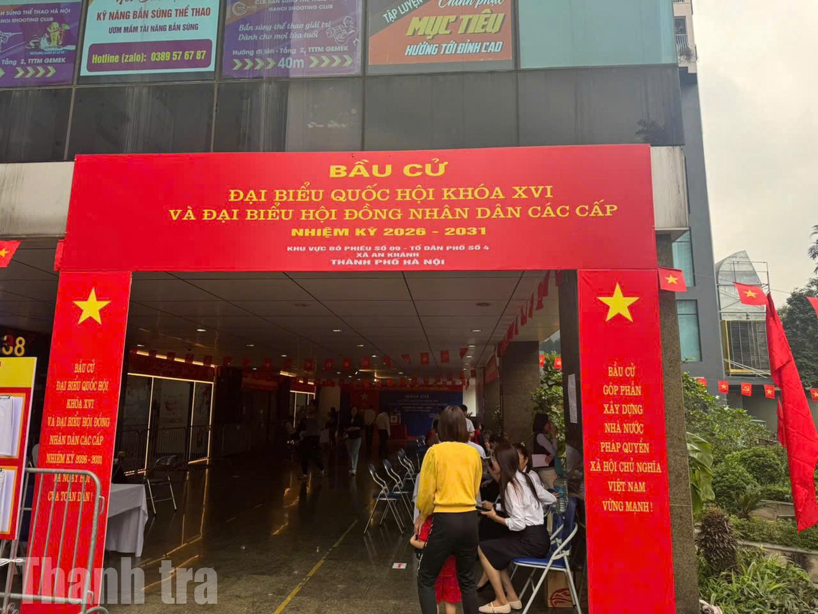 Những lá cờ đỏ sao vàng, băng rôn, khẩu hiệu được trang hoàng rực rỡ tại khu vực bỏ phiếu góp phần tạo nên không khí trang nghiêm, phấn khởi. Ảnh: Bảo Anh – Dương Nguyễn