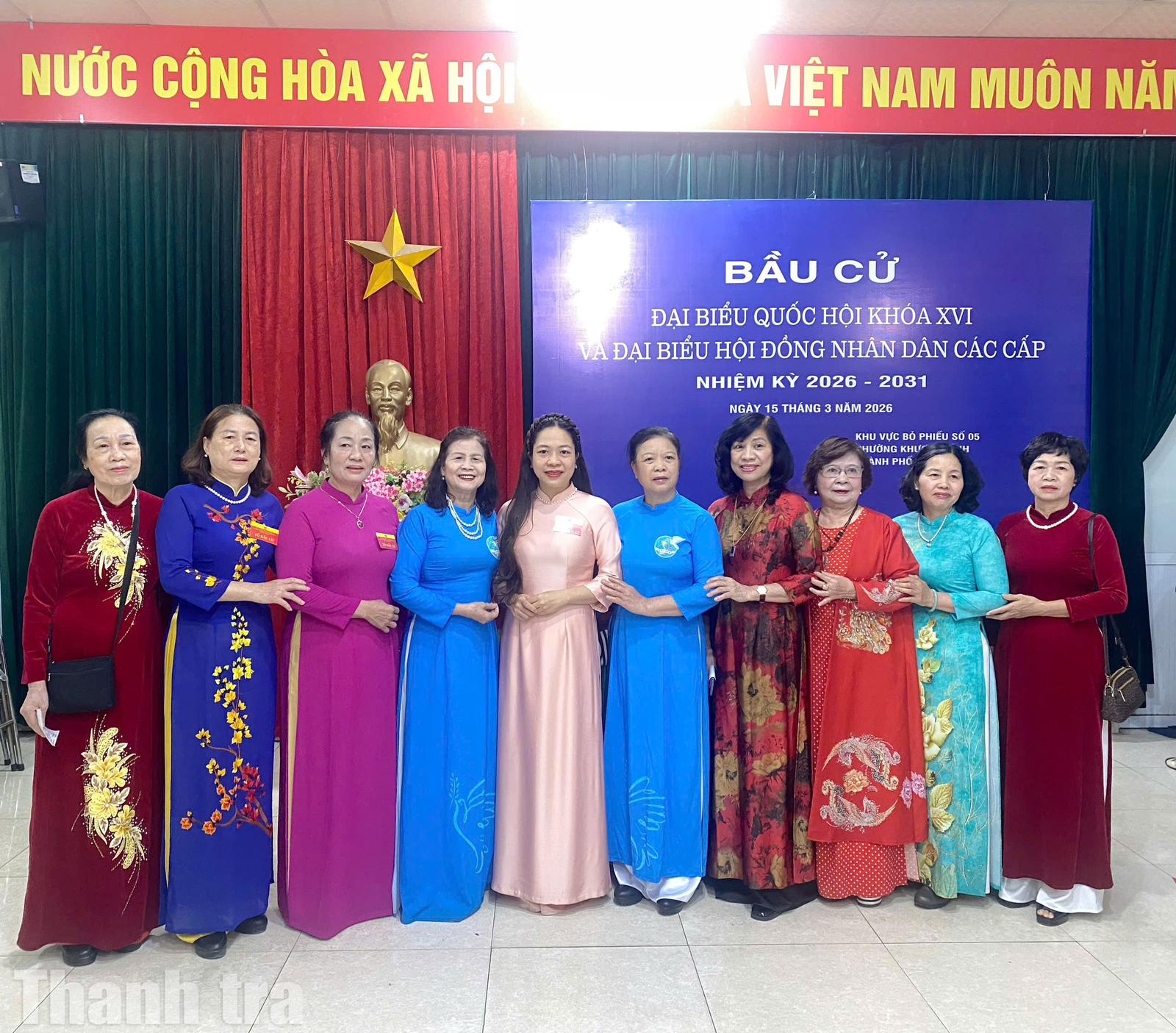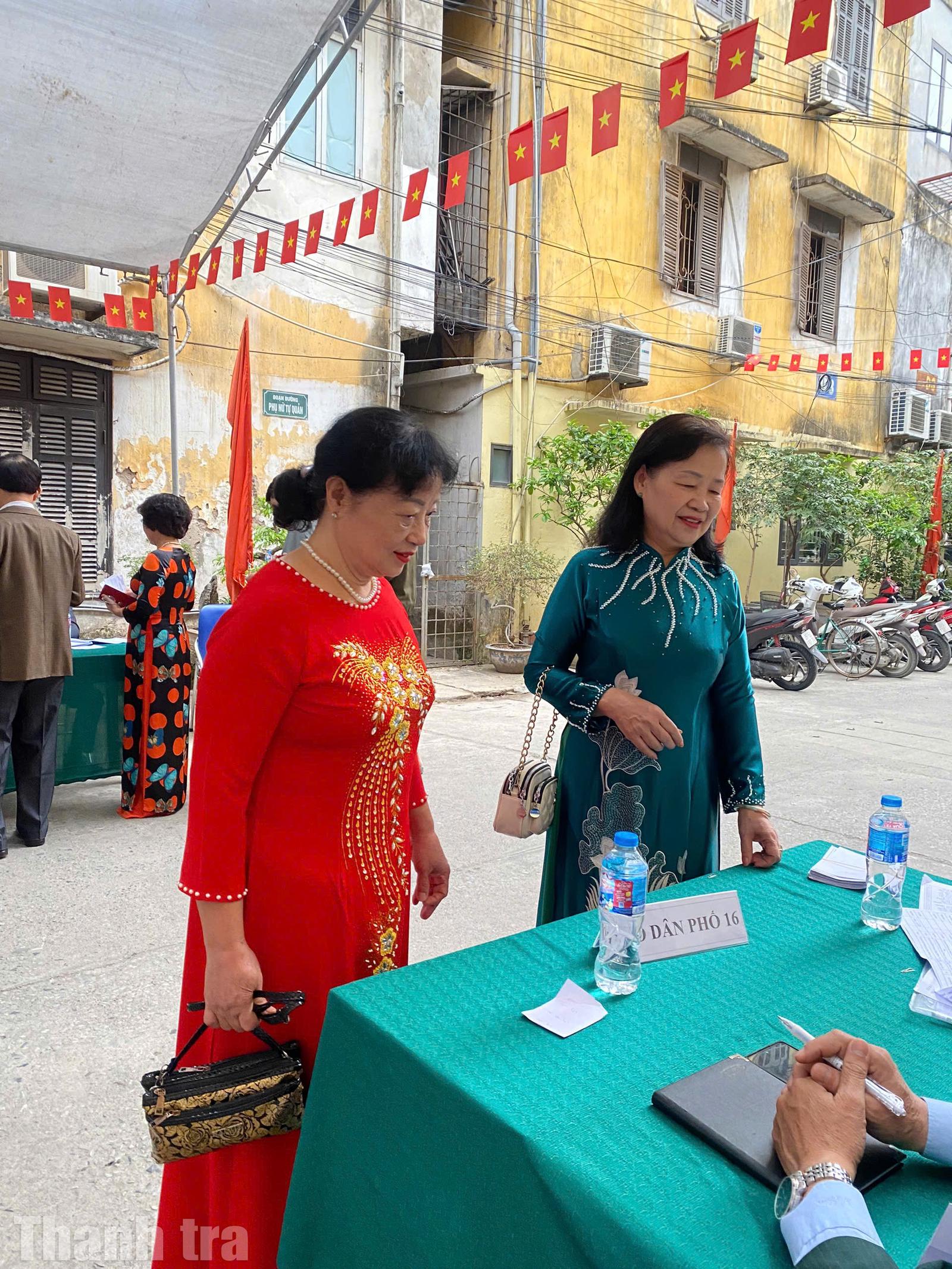 Từ các bà, các mẹ đến những bạn trẻ, ai cũng rạng rỡ trong trang phục áo dài khi thực hiện quyền công dân của mình. Những tà áo dài thướt tha hòa cùng sắc đỏ của cờ Tổ quốc khiến khu vực bỏ phiếu trở nên sinh động, đầy sức sống.