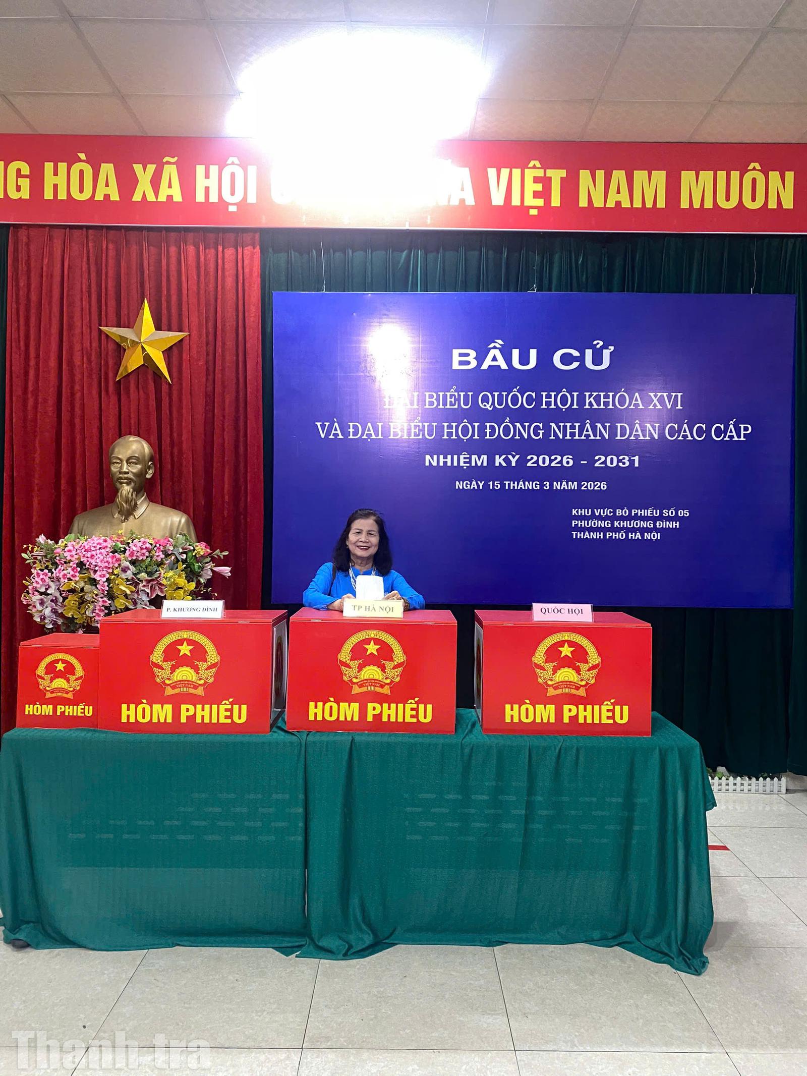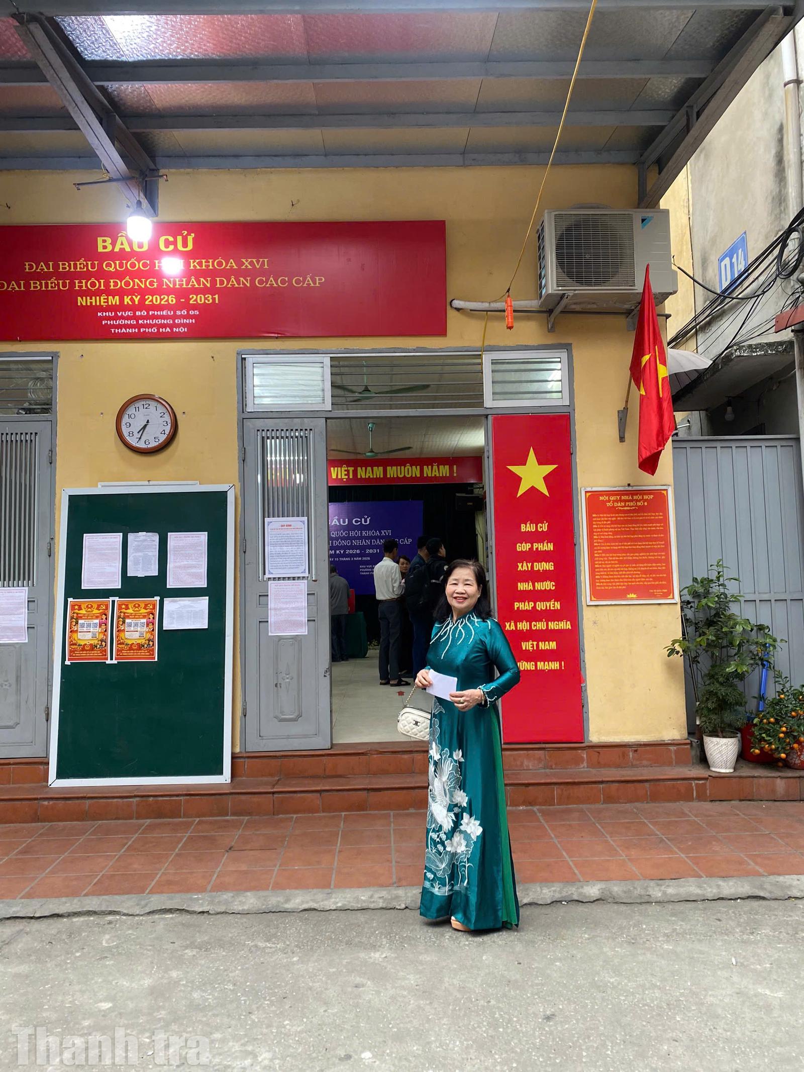 Tại phường Khương Đình (Hà Nội), không khí ngày bầu cử càng thêm rộn ràng khi nhiều người dân lựa chọn mặc áo dài truyền thống đến khu vực bỏ phiếu. Hình ảnh những tà áo dài đủ sắc màu xuất hiện tại điểm bầu cử đã tạo nên một nét đẹp đặc biệt, góp phần làm nổi bật không khí trang trọng nhưng vẫn tươi vui của ngày hội.