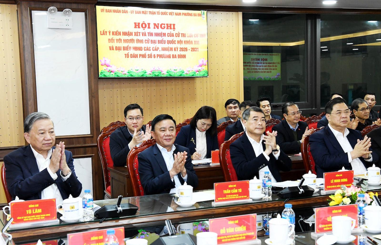 Tại hội nghị, cử tri đã nghe giới thiệu các tiêu chuẩn của người ứng cử đại biểu Quốc hội khóa XVI và tóm tắt tiểu sử 7 người ứng cử đại biểu Quốc hội khóa XVI, hiện đang cư trú trên địa bàn phường Ba Đình, gồm: Tổng Bí thư Tô Lâm; Chủ tịch Quốc hội Trần Thanh Mẫn; Thường trực Ban Bí thư Trần Cẩm Tú; Phó Chủ tịch Thường trực Quốc hội Đỗ Văn Chiến; Trưởng Ban Tổ chức Trung ương Lê Minh Hưng; Trưởng Ban Nội chính Trung ương Lê Minh Trí; Chủ nhiệm Văn phòng Chủ tịch nước Lê Khánh Hải.