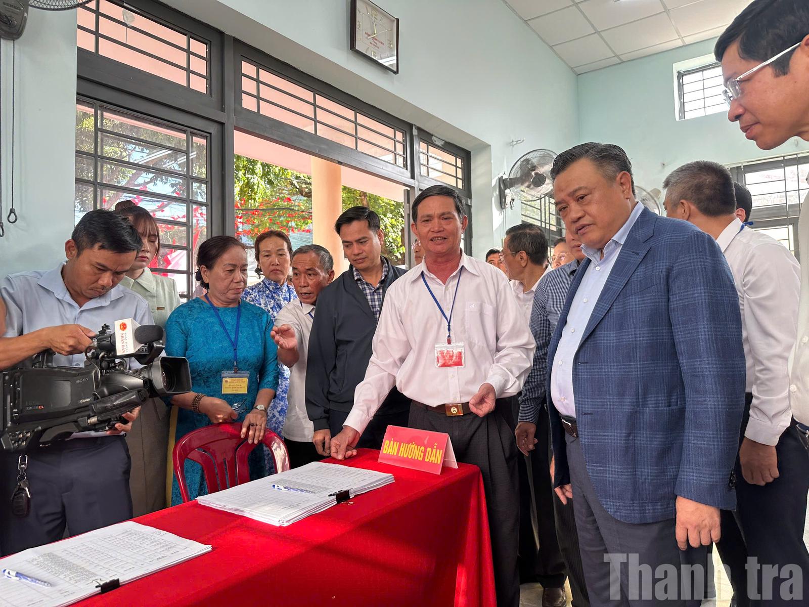 Ủy viên Bộ Chính trị, Chủ nhiệm Ủy ban Kiểm tra Trung ương Trần Sỹ Thanh làm Trưởng đoàn đã kiểm tra thực tế công tác chuẩn bị tại Khu vực bỏ phiếu số 38, phường Buôn Ma Thuột. Ảnh: TA