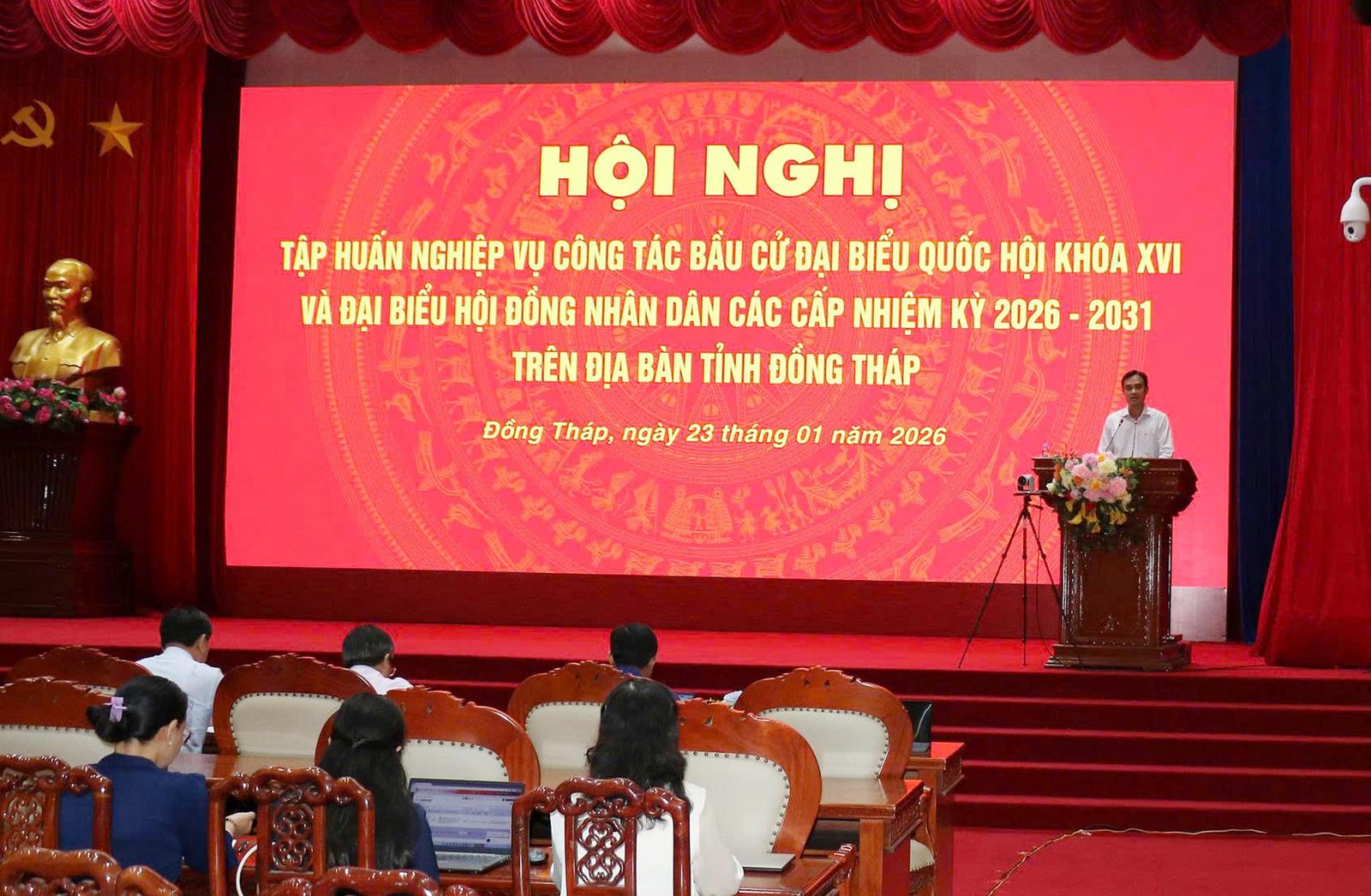 Ngày 23/01/2026, Ủy ban Bầu cử tỉnh Đồng Tháp đã tổ chức Hội nghị tập huấn nghiệp vụ công tác bầu cử đại biểu Quốc hội khóa XVI và đại biểu các cấp nhiệm kỳ 2026 - 2031 theo hình thức trực tiếp tại Trung tâm Hội nghị tỉnh và trực tuyến đến điểm cầu các xã, phường. Hội nghị đã nghe 4 chuyên đề: thực hiện nhiệm vụ, quyền hạn của Ban bầu cử; thực hiện nhiệm vụ, quyền hạn của Tổ bầu cử và công tác chuẩn bị bầu cử; nhiệm vụ, quyền hạn của Tổ bầu cử trong ngày bầu cử; cử tri và công tác lập, niêm yết danh sách cử tri.