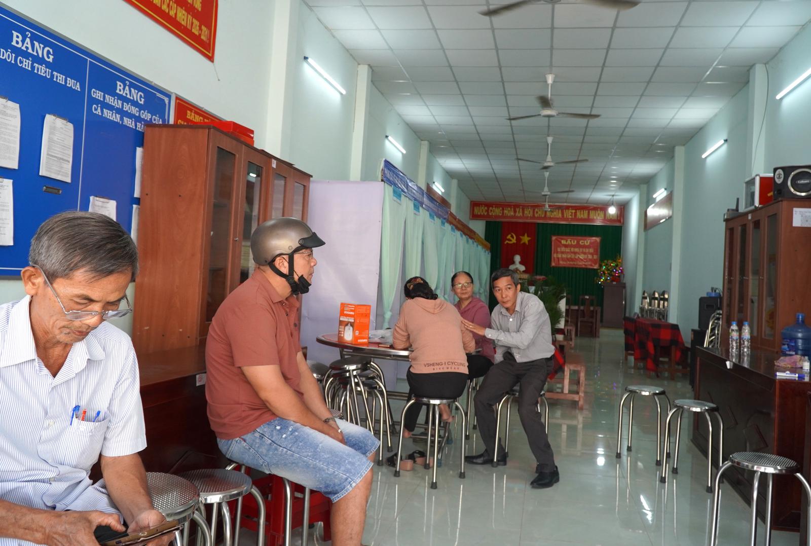 Cử tri đến nhận phiếu tại điểm bầu cử Nhà văn hóa Ấp I, phường Mỹ Tho (Ảnh: ĐQ)