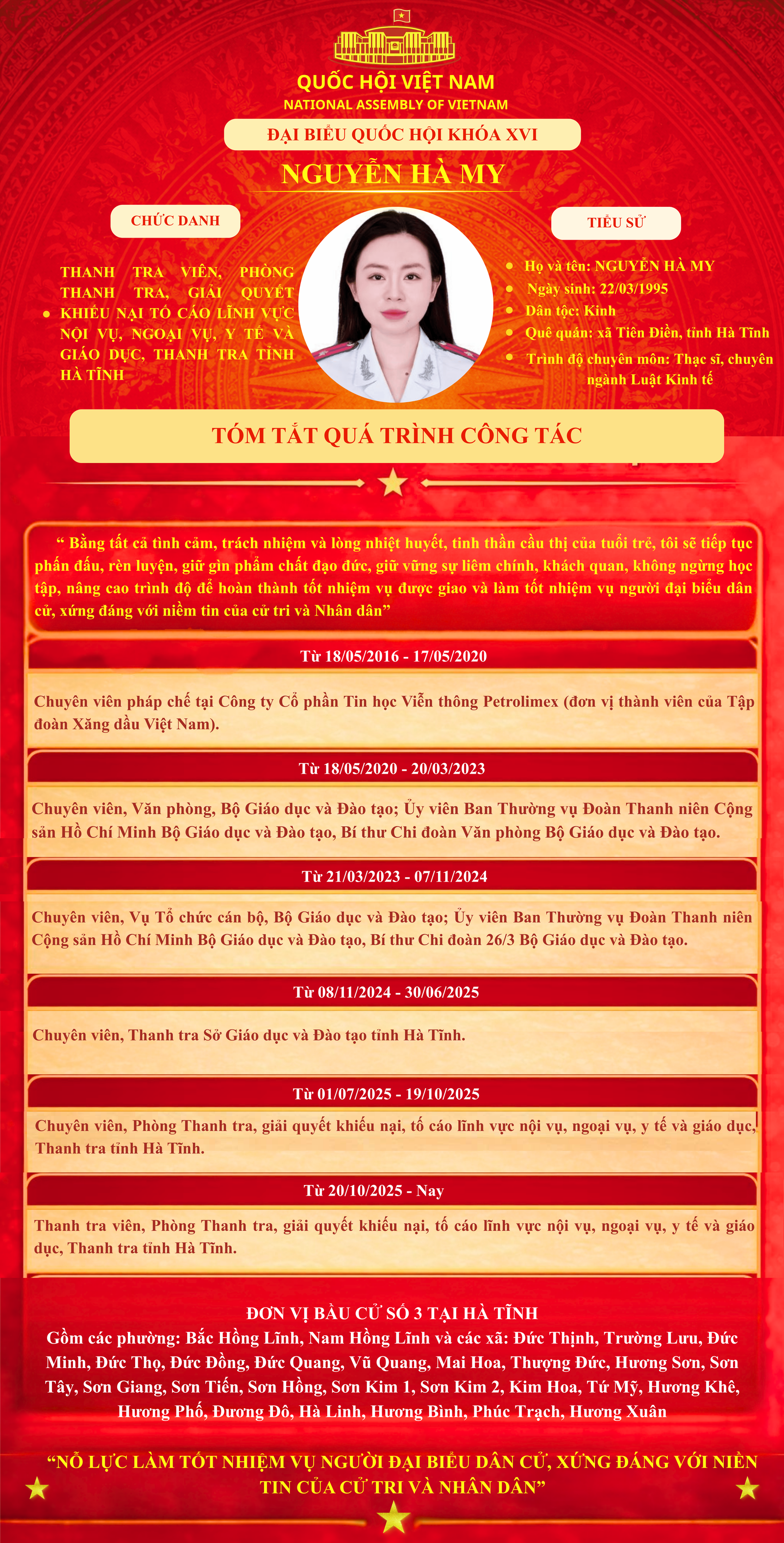 (Thanh tra) - Theo danh sách 500 người trúng cử đại biểu Quốc hội khóa XVI theo từng đơn vị bầu cử do Hội đồng Bầu cử quốc gia công bố, có thanh tra viên Nguyễn Hà My là một ứng cử viên nữ, trẻ tuổi, đặc biệt quan tâm đến thanh niên, phụ nữ, trẻ em và gia đình. Với nhiều năm công tác trong ngành giáo dục và hiện làm công tác thanh tra lĩnh vực y tế, thanh tra viên Nguyễn Hà My thấu hiểu những khó khăn cụ thể mà người dân địa phương đang đối mặt.