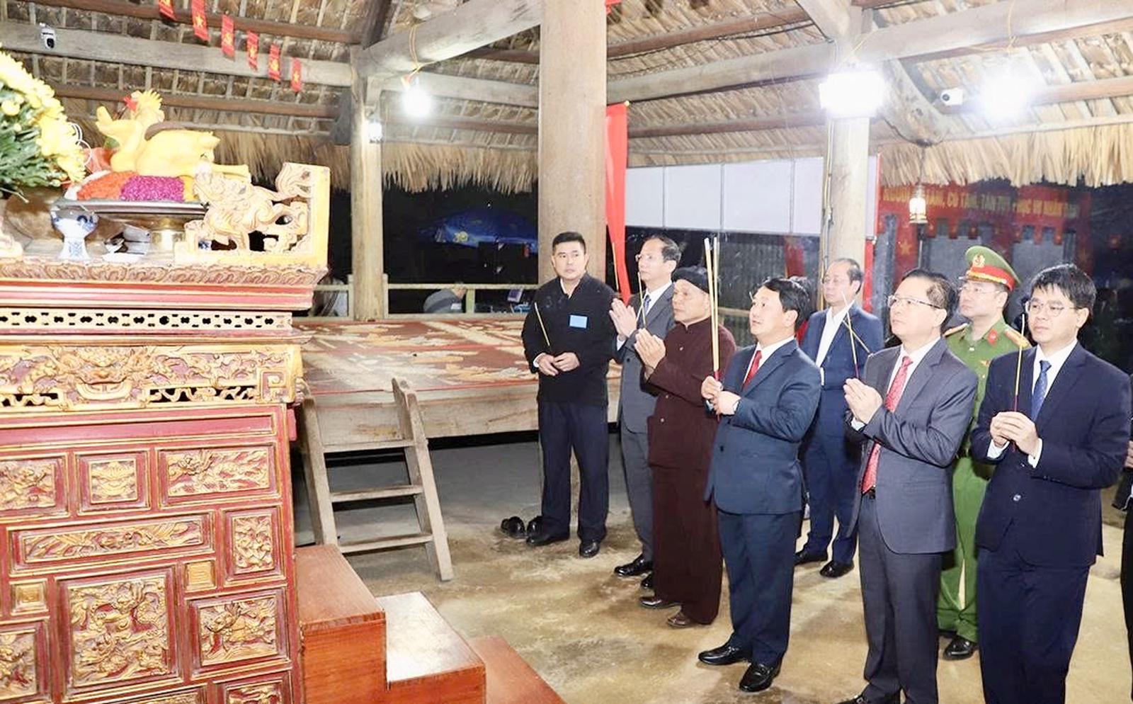 Bí thư Tỉnh ủy Tuyên Quang Hầu A Lềnh và các đại biểu dâng hương, hoa tại Đình Tân Trào trước giờ khai mạc cuộc bầu cử. Ảnh: Văn Nghị