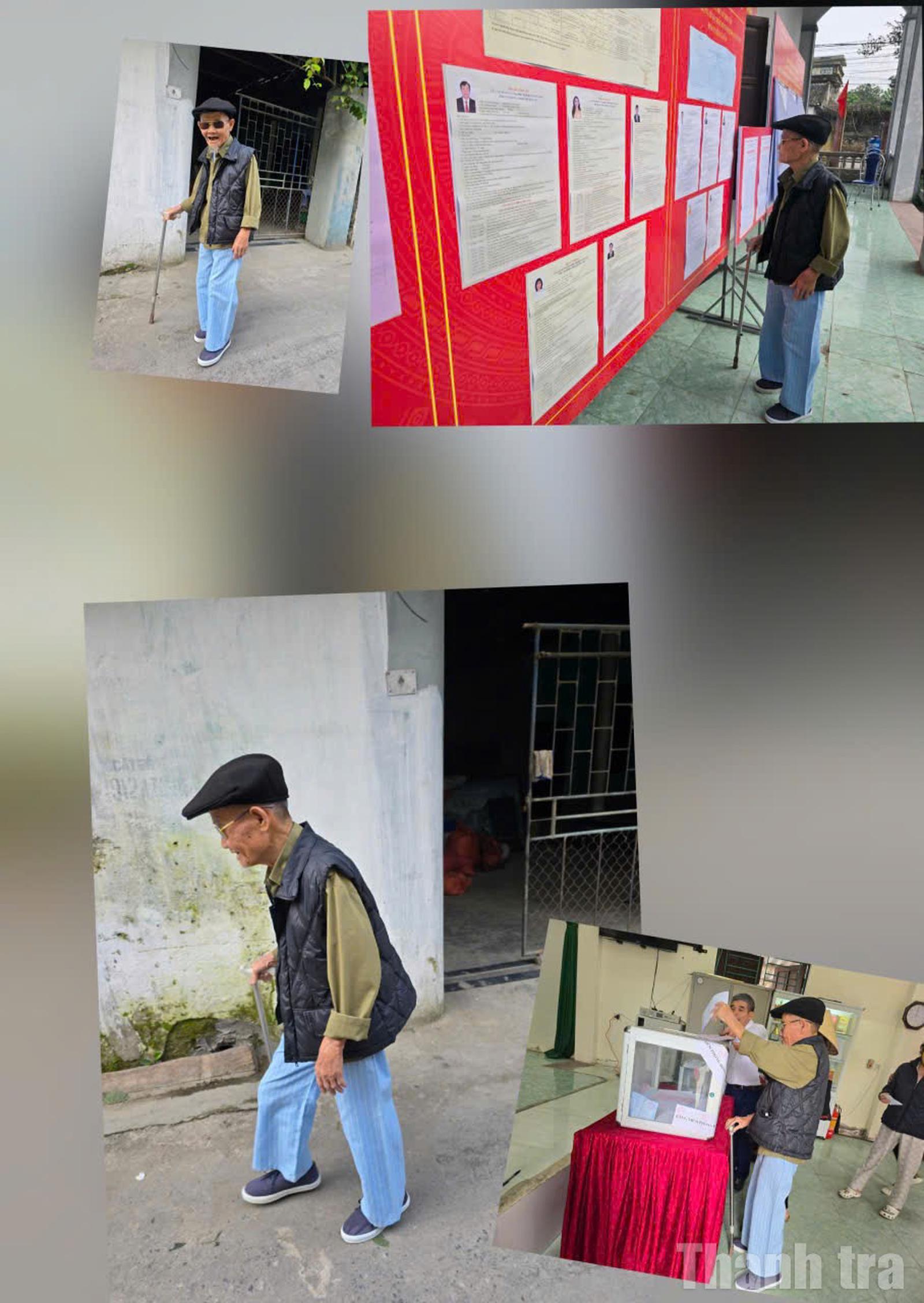 Cụ già 83 tuổi ở Thanh Hóa chống gậy đi bỏ phiếu sớm và mong những người được lựa chọn lần này đều đủ đức, đủ tài để nói lên tiếng nói của Nhân dân. Ảnh: Văn Thanh