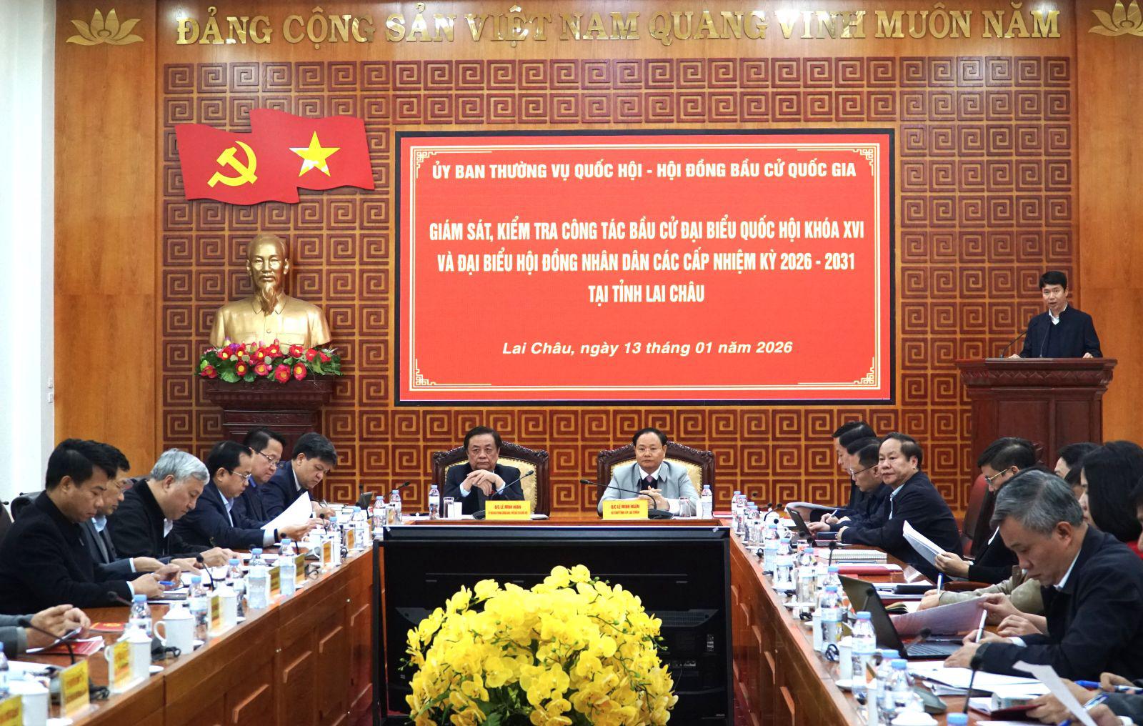 Trong không khí khẩn trương chuẩn bị cho sự kiện chính trị trọng đại của đất nước, sáng ngày 13/1, Đoàn công tác của Quốc hội do ông Lê Minh Hoan - Phó Chủ tịch Quốc hội làm Trưởng đoàn đã có buổi làm việc với Ủy ban Bầu cử (UBBC) tỉnh Lai Châu.