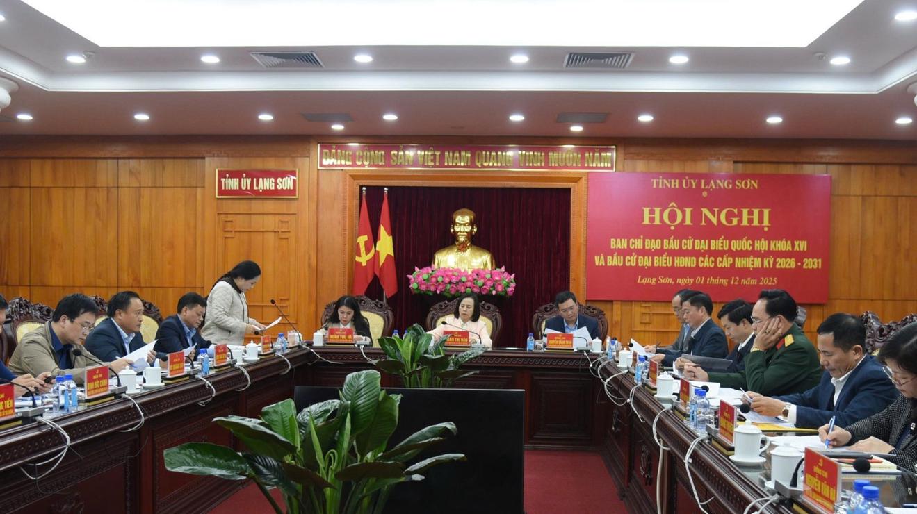 (Thanh tra) - Chiều 1/12, Ban Chỉ đạo bầu cử đại biểu Quốc hội khóa XVI và bầu cử đại biểu HĐND các cấp tỉnh Lạng Sơn, nhiệm kỳ 2026 - 2031, tổ chức hội nghị thảo luận, thống nhất ban hành một số văn bản và chỉ đạo các nhiệm vụ trọng tâm về công tác bầu cử. Phó Bí thư Thường trực Tỉnh ủy, Chủ tịch HĐND tỉnh, Phó Trưởng ban Thường trực Ban Chỉ đạo bầu cử tỉnh Đoàn Thị Hậu chủ trì hội nghị.