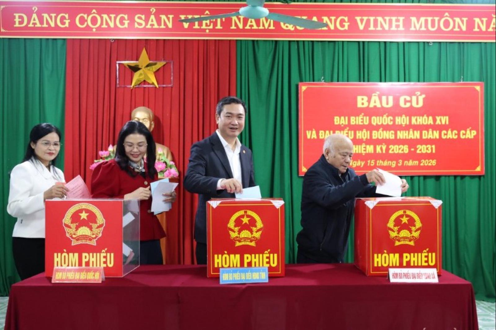 Cùng tham dự có ông Hoàng Quốc Khánh, Ủy viên Trung ương Đảng, Bí thư Tỉnh ủy, Trưởng Ban chỉ đạo bầu cử tỉnh. Hai cử tri đã bỏ những lá phiếu đầu tiên tại khu vực bầu cử này.