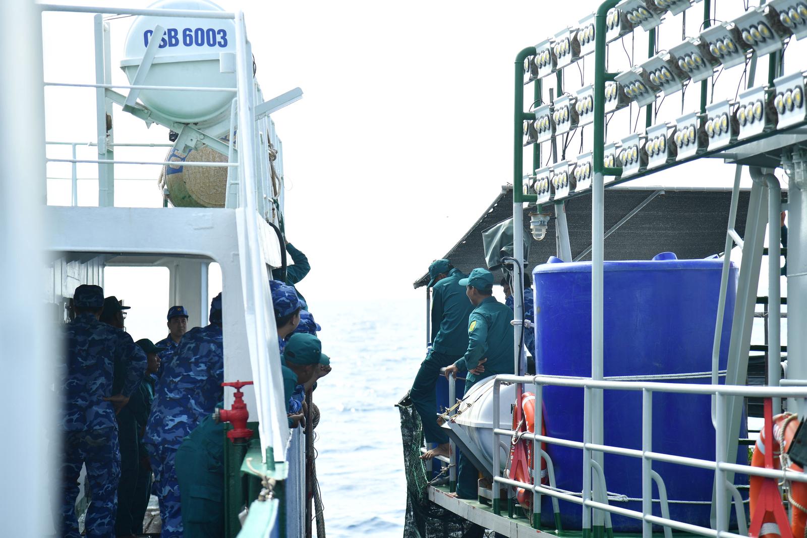 Tàu cảnh sát biển 6003 cùng các thành viên tổ bầu cử hành trình tới từng tàu thực hiện nhiệm vụ trên biển để tổ chức bầu cử. Ảnh: Đức Thái