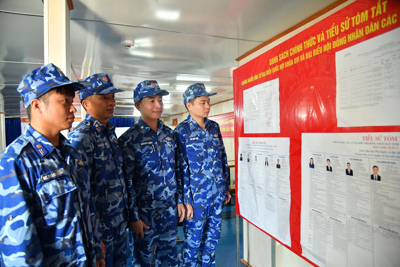 Tại các tàu đang thực hiện nhiệm vụ, không khí bầu cử diễn ra khẩn trương, nghiêm túc, trang trọng dù trong điều kiện sóng gió và thời tiết khắc nghiệt. Sau khi nghe phổ biến quy chế và nghiên cứu kỹ danh sách ứng cử viên, từng cán bộ, chiến sĩ lần lượt bỏ phiếu, thể hiện trách nhiệm và niềm tin đối với các cơ quan quyền lực Nhà nước.