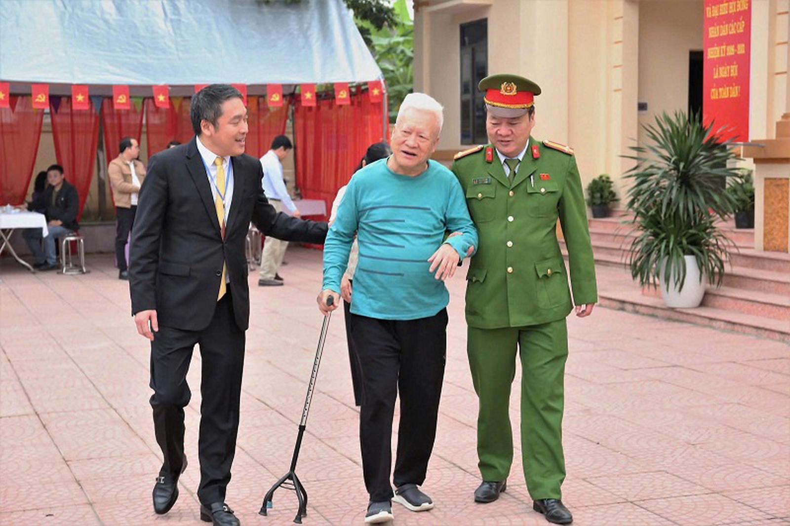 Bí thư xã Sóc Sơn và cán bộ hỗ trợ cử tri sức khỏe yếu tham gia bỏ phiếu tại điểm bầu cử ở xã Sóc Sơn.