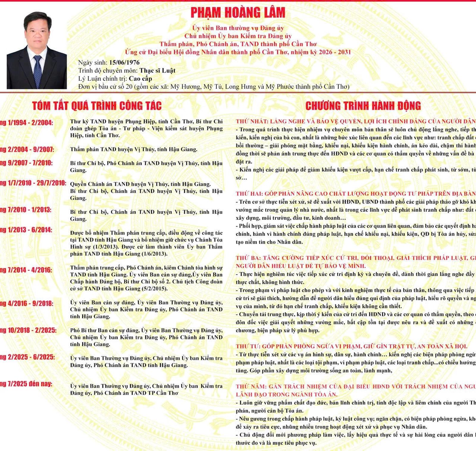 Trong chương trình hành động, Phó Chánh án TAND TP Cần Thơ Phạm Hoàng Lâm cam kết nếu được cử tri tín nhiệm bầu làm đại biểu HĐND TP Cần Thơ nhiệm kỳ 2026-2031, ông sẽ tập trung vào những việc làm thiết thực, sát thực tế. Luôn lắng nghe và hiểu tâm lý, mong muốn của người dân.