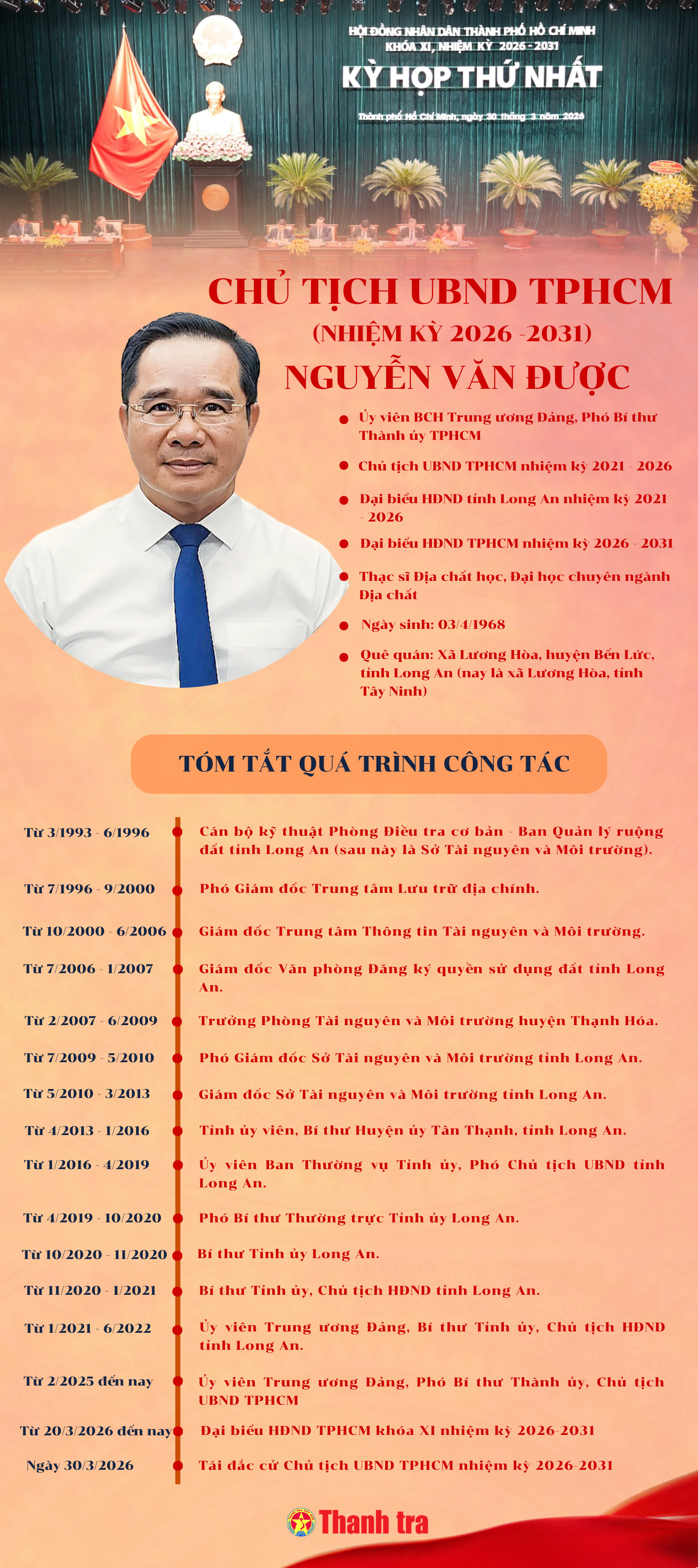Dưới đây là tóm tắt tiểu sử của ông Nguyễn Văn Được, Chủ tịch UBND TPHCM nhiệm kỳ 2026 – 2031.