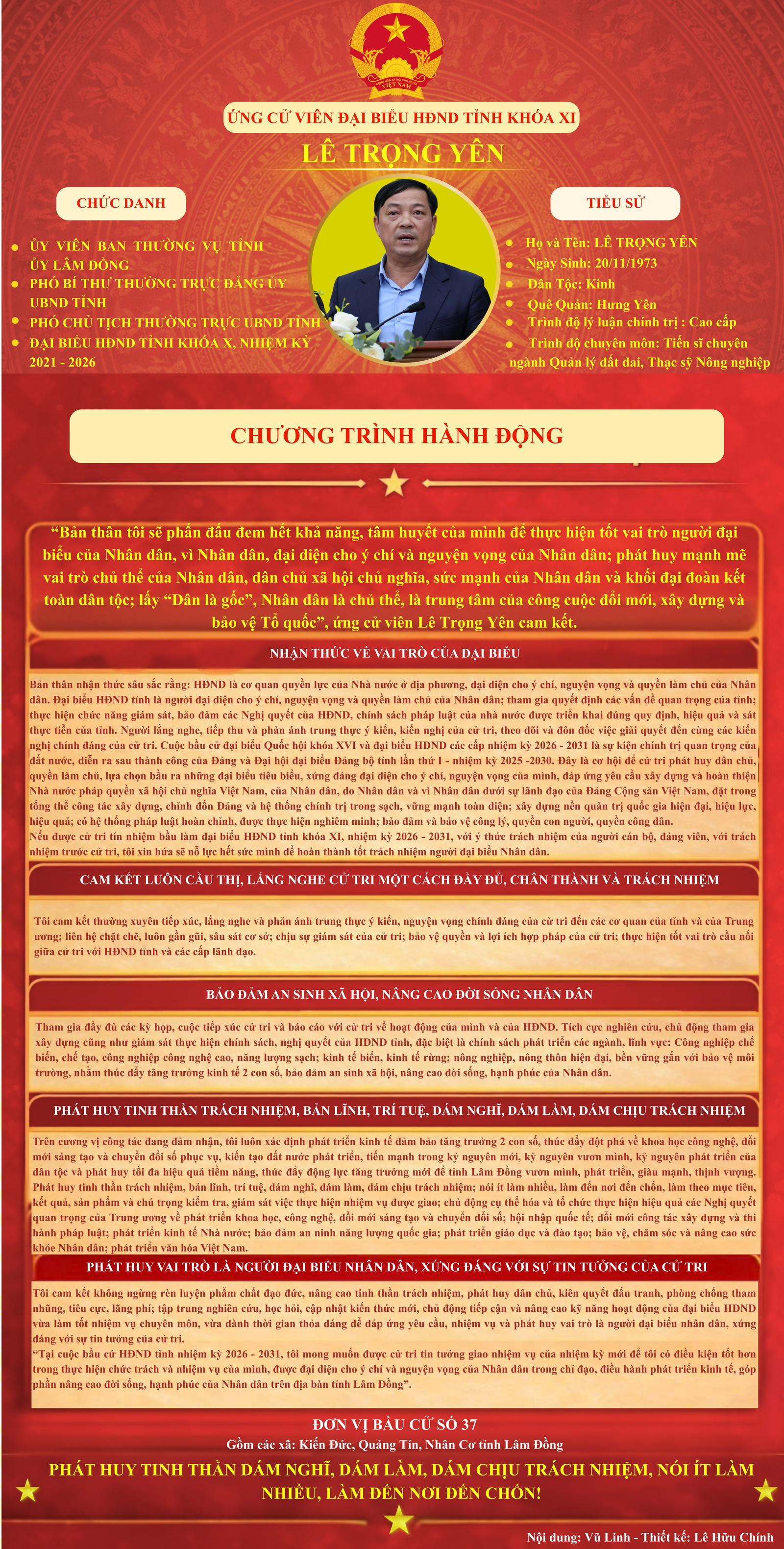 (Thanh tra) - Hướng tới cuộc bầu cử đại biểu Quốc hội khóa XVI và đại biểu HĐND các cấp nhiệm kỳ 2026 – 2031, Báo Thanh tra trân trọng giới thiệu Chương trình hành động của ông Lê Trọng Yên, Phó Chủ tịch Thường trực UBND tỉnh Lâm Đồng ứng cử viên đại biểu HĐND tỉnh khóa XI, nhiệm kỳ 2026 – 2031 tại đơn vị bầu cử số 37 (gồm các xã: Kiến Đức, Quảng Tín, Nhân Cơ).