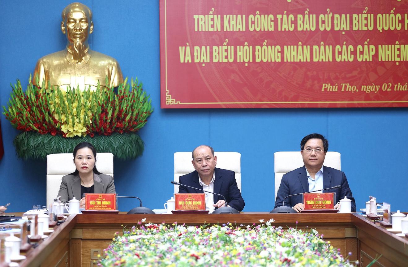 Chủ trì hội nghị gồm ông Bùi Đức Hinh - Phó Bí thư Tỉnh ủy, Chủ tịch HĐND tỉnh, Chủ tịch Ủy ban bầu cử tỉnh Phú Thọ; ông Trần Duy Đông - Phó Bí thư Tỉnh ủy, Chủ tịch UBND tỉnh, Phó Chủ tịch Thường trực Ủy ban bầu cử tỉnh và bà Bùi Thị Minh - Phó Bí thư Tỉnh ủy, Chủ tịch Ủy ban MTTQ tỉnh, Phó Chủ tịch Ủy ban bầu cử tỉnh.