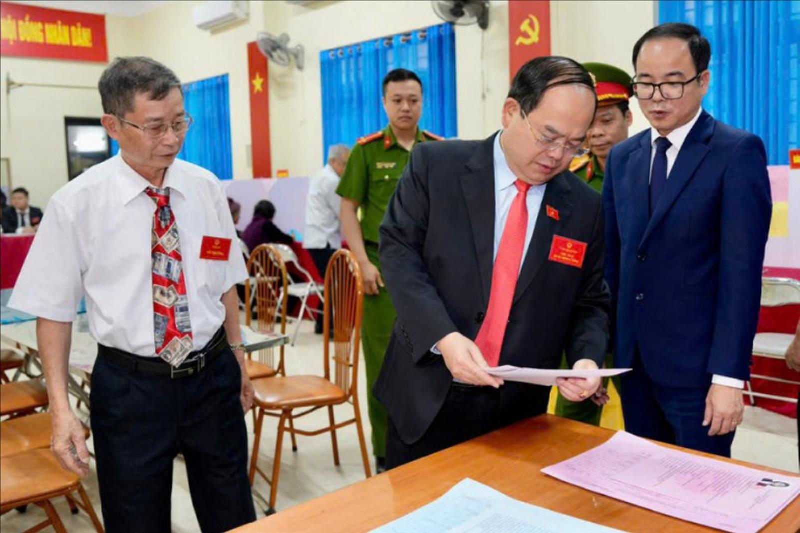 Bí thư Tỉnh ủy Quảng Ninh Quản Minh Cường, Trưởng đoàn đại biểu Quốc hội tỉnh, Trưởng Ban chỉ đạo, Chủ tịch Ủy ban bầu cử tỉnh kiểm tra công tác bầu cử tại khu vực bỏ phiếu số 20, phường Hồng Gai. Ảnh: Thu Chung