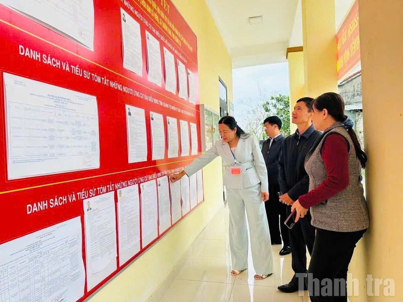 Phó Bí thư thường trực Đảng ủy xã Trường Ninh Lê Thị Thu Hà kiểm tra đơn vị bầu cử số 5. Ảnh: LHC