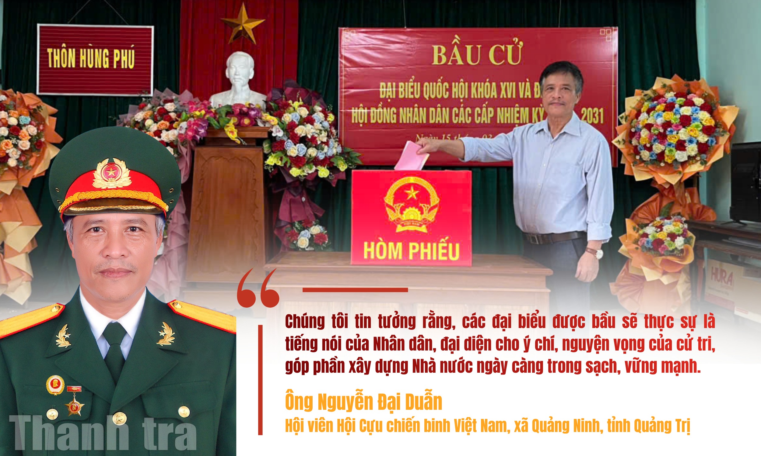 Sau thành công của cuộc bầu cử đại biểu Quốc hội khóa XVI và HĐND các cấp nhiệm kỳ 2026 - 2031, không khí phấn khởi, tin tưởng đang lan tỏa sâu rộng trong các tầng lớp Nhân dân. Chia sẻ về điều này, ông Nguyễn Đại Duẫn, hội viên Hội Cựu chiến binh Việt Nam, xã Quảng Ninh, tỉnh Quảng Trị bày tỏ niềm vui mừng trước kết quả của một kỳ bầu cử dân chủ, đúng pháp luật, thực sự là ngày hội lớn của toàn dân.