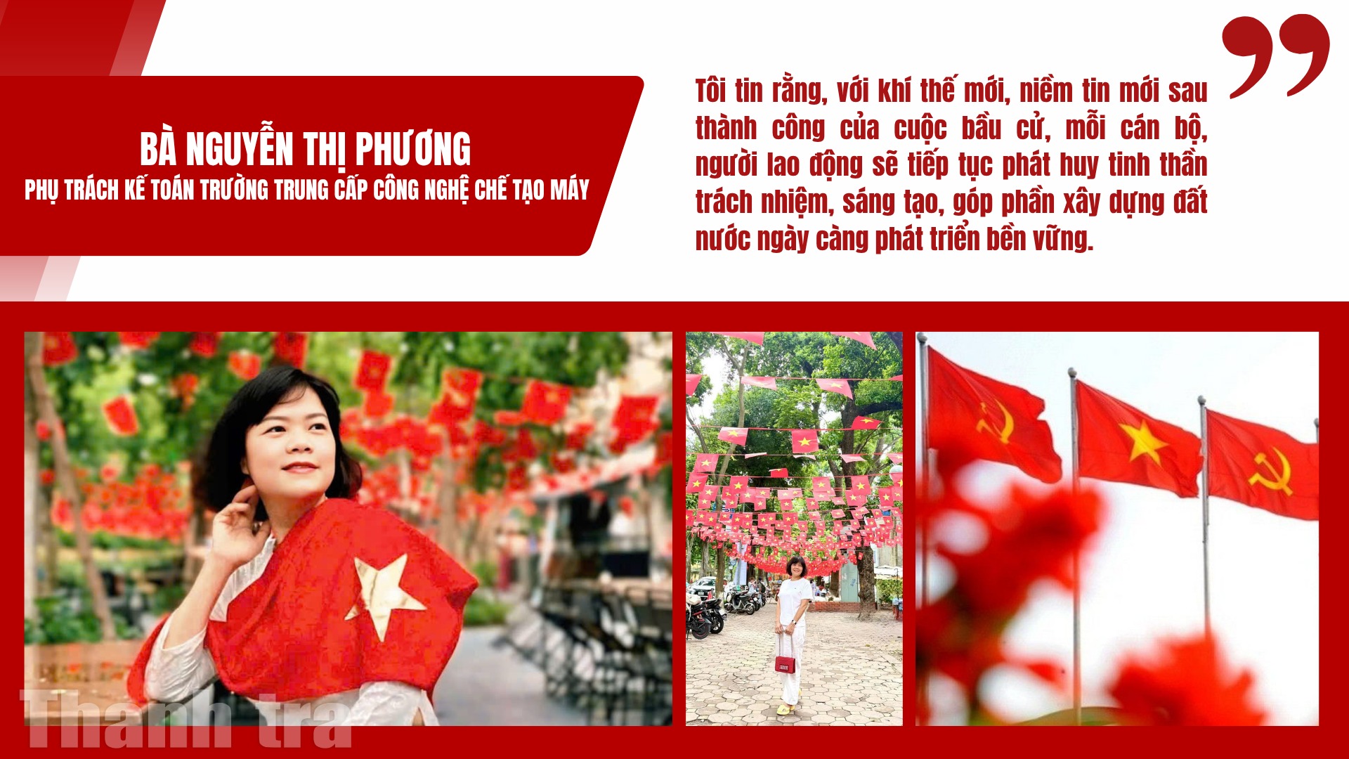 “Tôi tin rằng, với khí thế mới, niềm tin mới sau thành công của cuộc bầu cử, mỗi cán bộ, người lao động sẽ tiếp tục phát huy tinh thần trách nhiệm, sáng tạo, góp phần xây dựng đất nước ngày càng phát triển bền vững”, bà Phương chia sẻ.