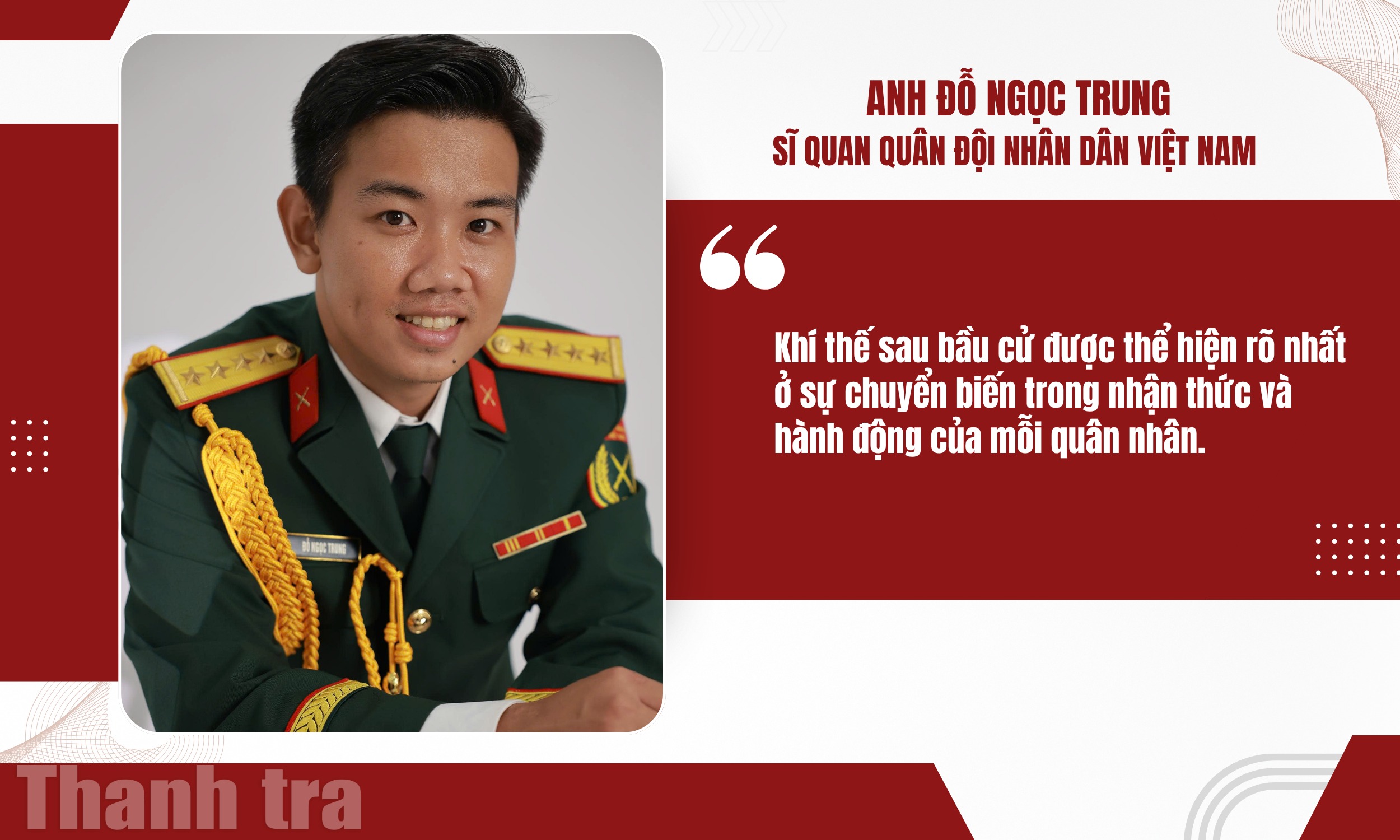 Tiếp nối dòng chảy niềm tin từ cơ sở, trong lực lượng vũ trang, anh Đỗ Ngọc Trung, sĩ quan Quân đội nhân dân Việt Nam cho rằng, khí thế sau bầu cử được thể hiện rõ nhất ở sự chuyển biến trong nhận thức và hành động của mỗi quân nhân.