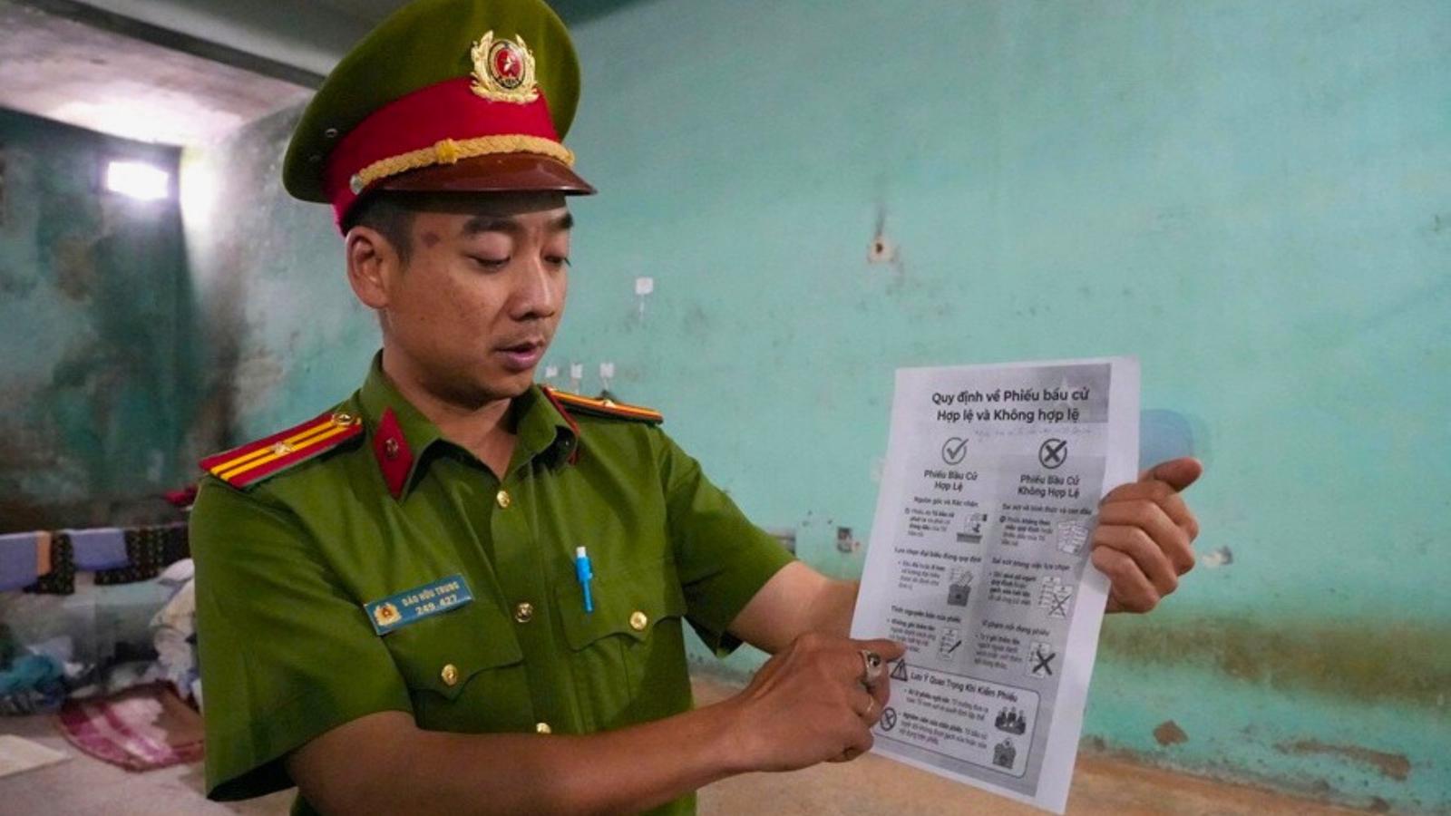 Cán bộ quản giáo tuyên truyền, hướng dẫn người bị tạm giữ, tạm giam thực hiện quyền bầu cử. Ảnh: HN