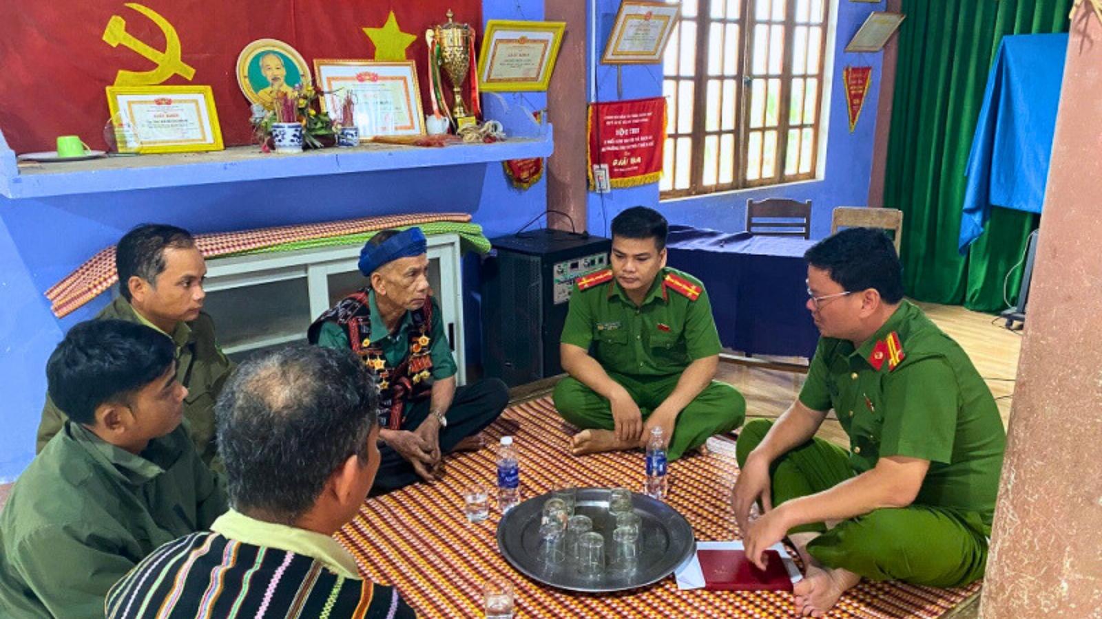 Già làng Hồ Văn Dương phối hợp với Công an xã Nam Đông trao đổi về công tác tuyên truyền bầu cử tại địa bàn. Ảnh: HN