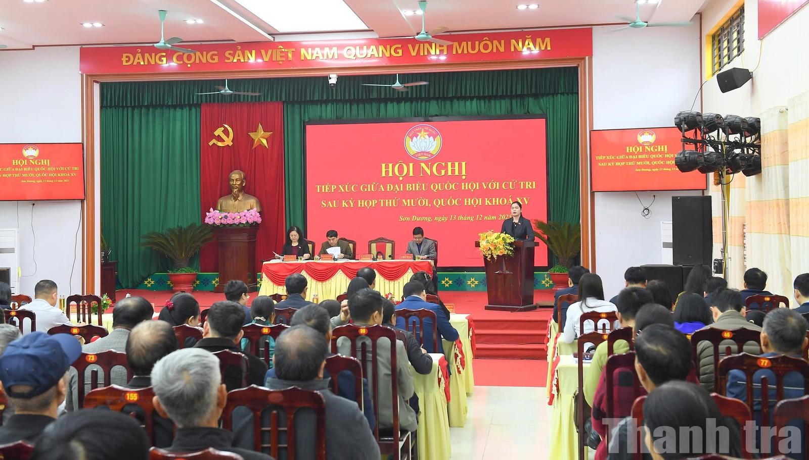 Báo cáo với các cử tri xã Sơn Dương, Phó Trưởng đoàn chuyên trách Đoàn đại biểu Quốc hội tỉnh Tuyên Quang Ma Thị Thúy đã thông báo về kết quả Kỳ họp thứ 10, Quốc hội khóa XV. Đây là kỳ họp thường lệ cuối cùng của nhiệm kỳ, quyết định nhiều vấn đề chiến lược, có ý nghĩa đặc biệt quan trọng đối với định hướng phát triển đất nước thời kỳ mới. Sau 40 ngày làm việc liên tục (từ ngày 20/10 đến ngày 11/12/2025) với tinh thần khẩn trương, nghiêm túc, khoa học, đổi mới, trách nhiệm cao, Kỳ họp thứ 10 đã thành công tốt đẹp, hoàn thành toàn bộ nội dung, chương trình đề ra.