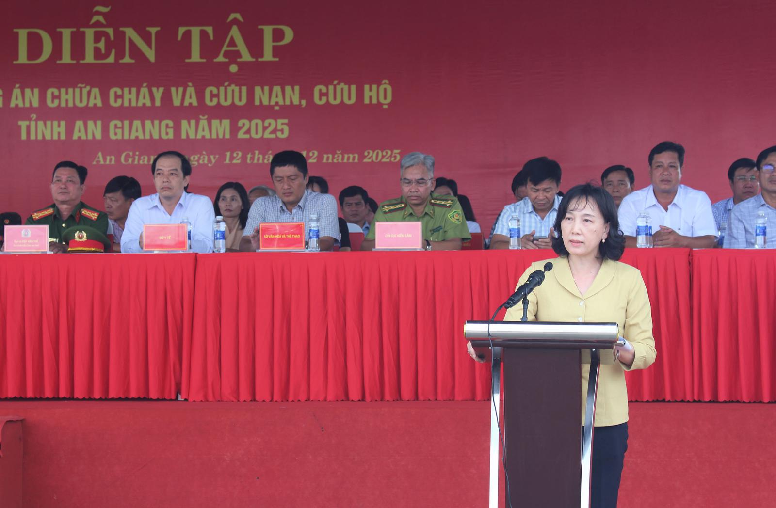 Bà Nguyễn Thị Minh Thúy, Phó Chủ tịch UBND tỉnh An Giang nhấn mạnh, diễn tập phòng cháy, chữa cháy và cứu nạn, cứu hộ là nhiệm vụ quan trọng, nhằm cụ thể hóa chỉ đạo của Trung ương và của tỉnh trong công tác phòng ngừa, ứng phó sự cố. Thông qua diễn tập, các lực lượng được kiểm tra thực chất khả năng chỉ huy, phối hợp và xử lý tình huống, đặc biệt là các tình huống nguy hiểm, bất ngờ.