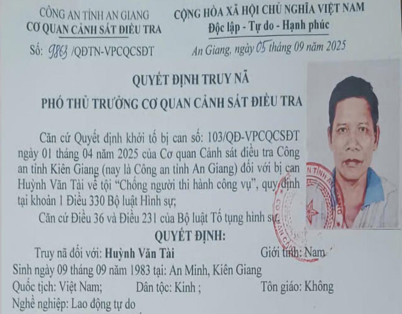 Chiều ngày 12/9, Cơ quan Cảnh sát điều tra, Công an tỉnh An Giang cho biết, đã ra quyết định truy nã đối với Huỳnh Văn Tài (sinh năm 1983, cư trú tại xã Vân Khánh, tỉnh An Giang) về tội chống người thi hành công vụ.