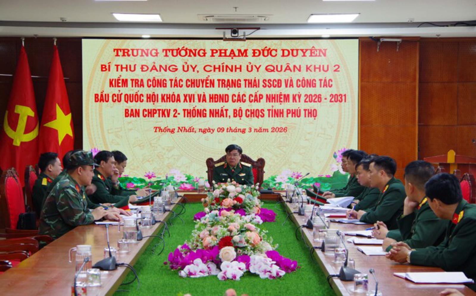 Đoàn công tác Bộ Tư lệnh Quân khu do Trung tướng Phạm Đức Duyên, Bí thư Đảng ủy, Chính ủy Quân khu làm trưởng đoàn đã kiểm tra việc chuyển trạng thái sẵn sàng chiến đấu và công tác chuẩn bị bầu cử đại biểu Quốc hội khóa XVI, đại biểu HĐND các cấp nhiệm kỳ 2026–2031 tại Ban Chỉ huy Phòng thủ khu vực 2 – Thống Nhất và Trung đoàn 814 (Bộ CHQS tỉnh Phú Thọ). Tham gia đoàn công tác có Thiếu tướng Nguyễn Ngọc Ngân, Phó Chủ nhiệm Chính trị Quân khu cùng đại diện các cơ quan chức năng Quân khu và Bộ CHQS tỉnh Phú Thọ.